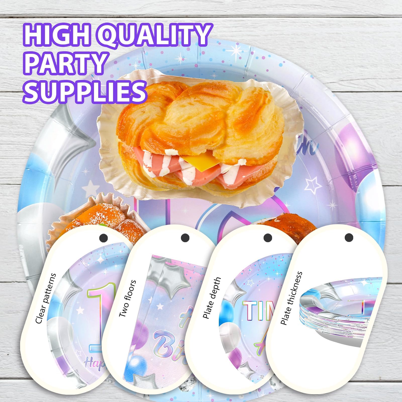Iridescent Design: Our girl birthday plates are based on iridescent gradient and dreamy color designs, with "18th Happy Birthday" words in the plate's middle, the surroundings decorated with balloons, blue and purple small dots, and some diamonds. The details really shine, perfect for official teen birthday decorations