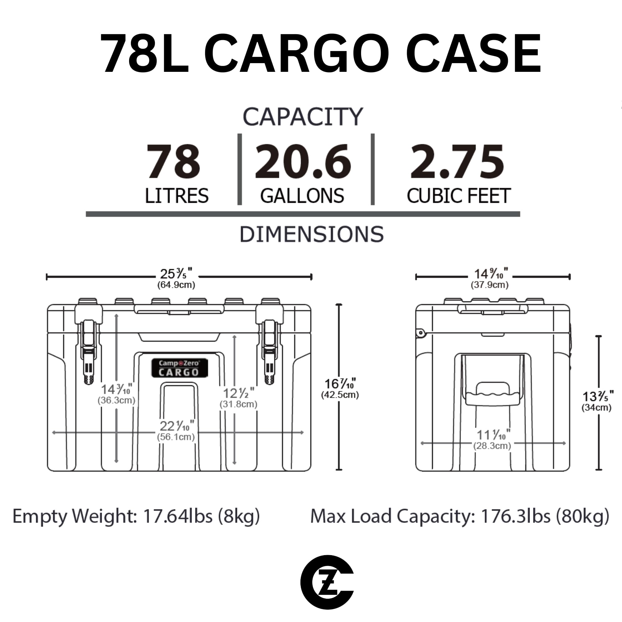 SPECIFACATIONS: Capacity: 78 Liters -20.6 Gallon Capacity | Outside Dims: 25.6 x 14.9 x 16.7 in. (L x W x H) Inside Dims: 22.1 x 10.9 x 14.5 in. (L x W x H) | Empty Weight: 17.86 lbs.