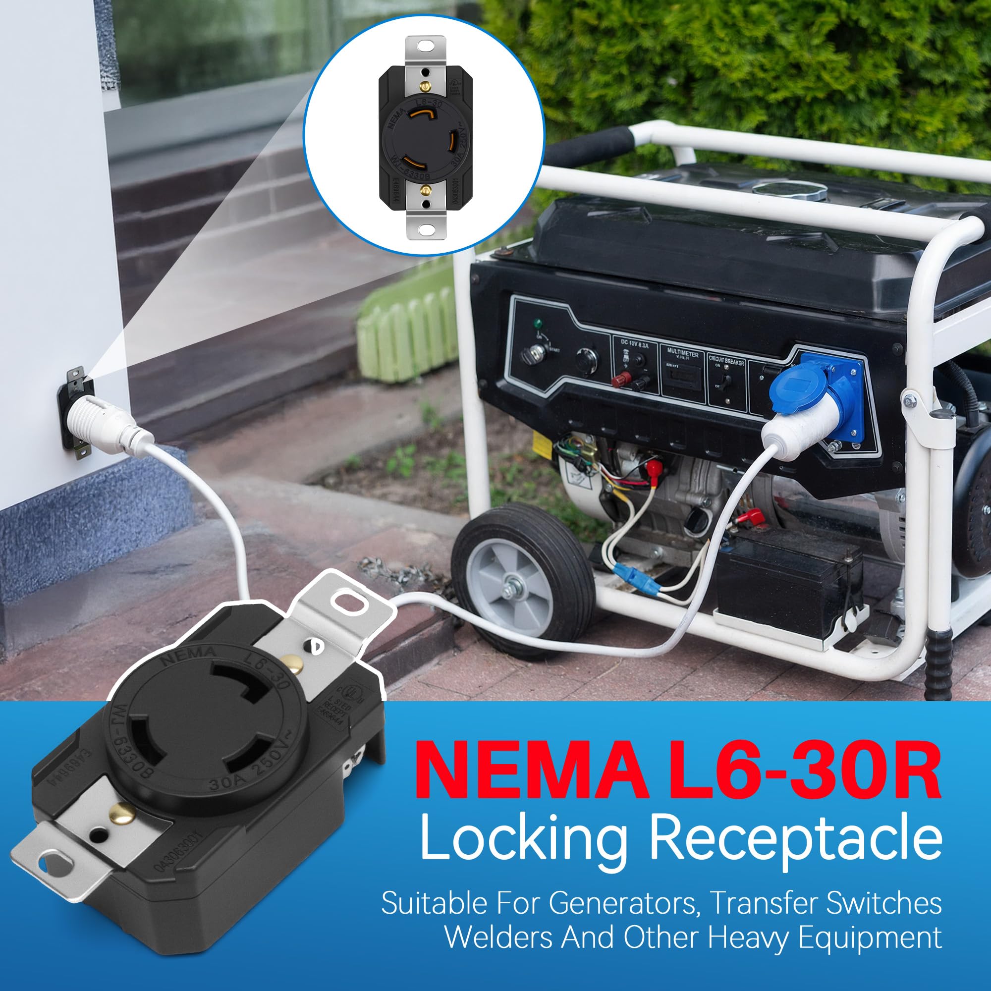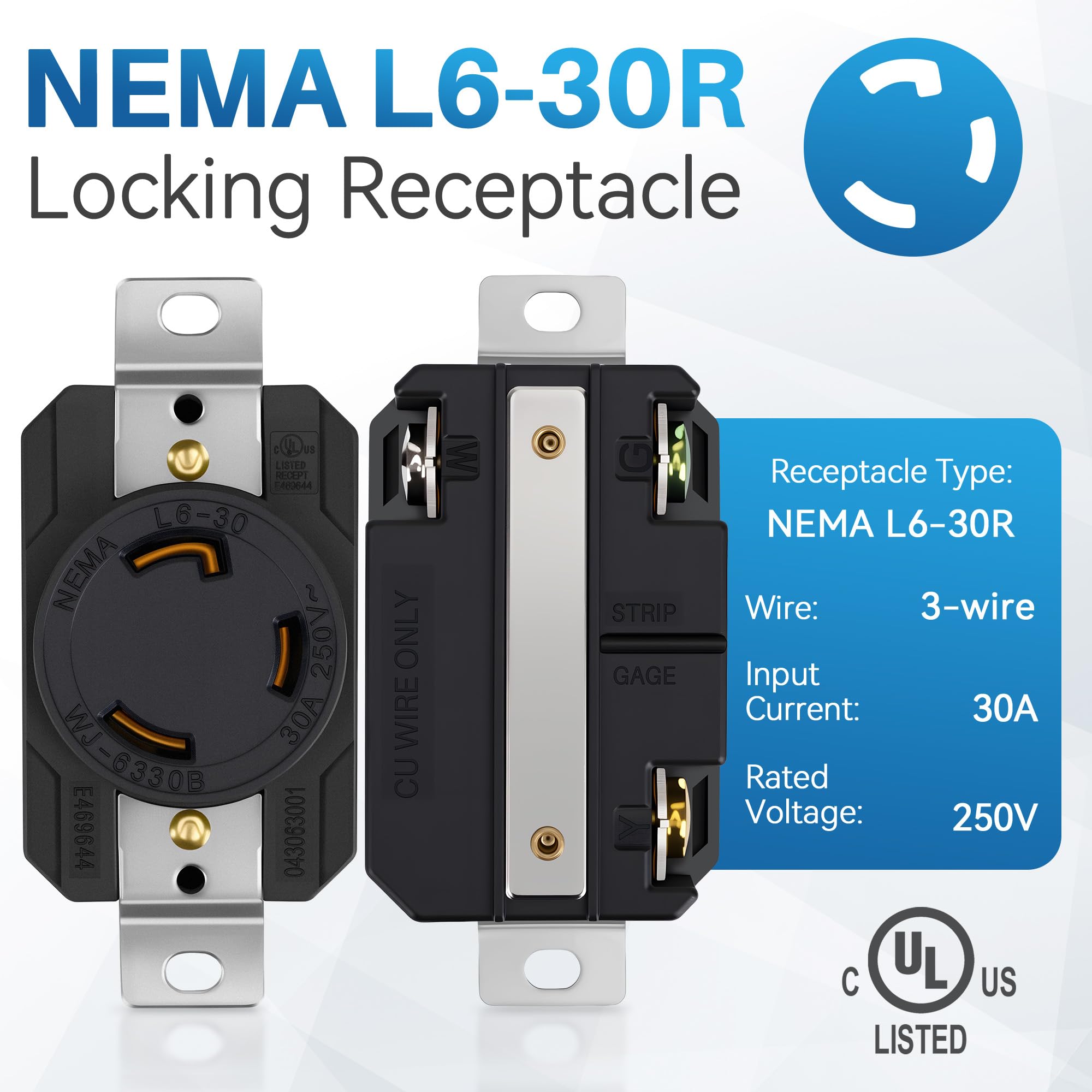 Wide Compatibility: This L6-30R receptacle is compatible with standard NEMA L6-30P plugs. Very suitable for various applications, including generators, RV power connections, data center PDUs, medical equipment, and industrial machinery.