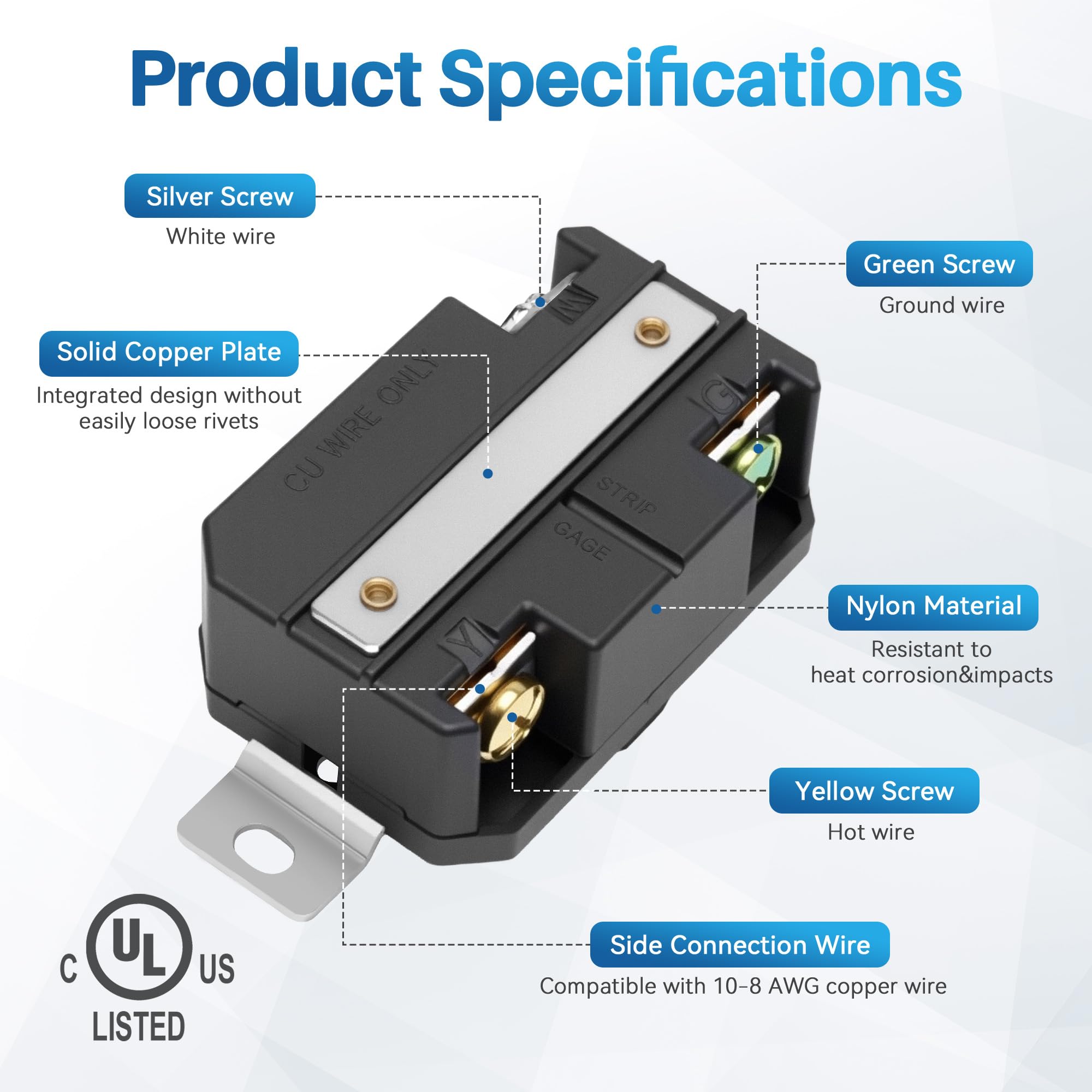 Easy to install: Three different colored wiring screws combined with back and side wiring design make installation more convenient and efficient. The serrated terminal board design ensures a secure wiring connection. This simplifies the installation of electrical enclosures, generator sets, and distribution panels. Suitable for # 10-8 AWG copper wire