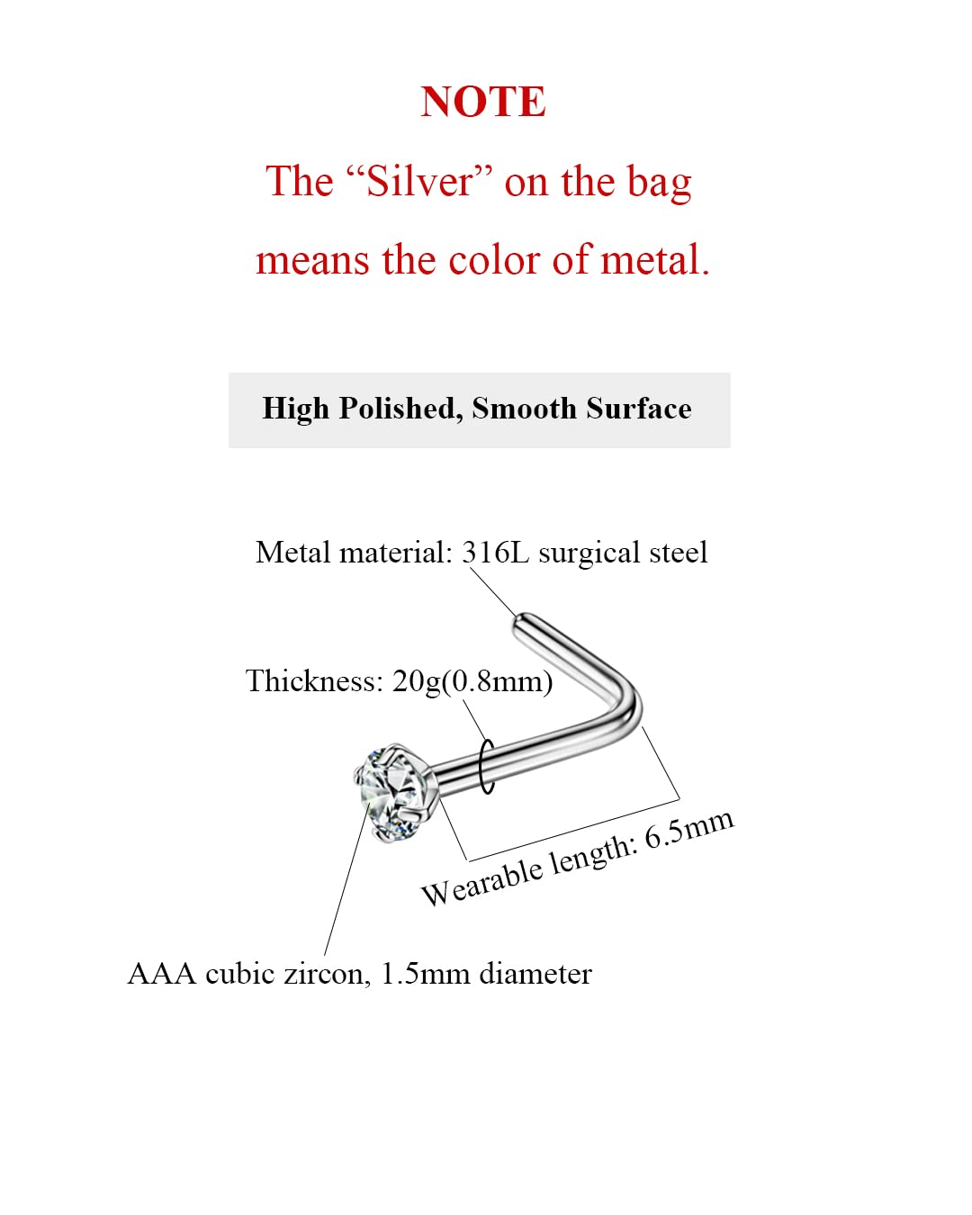 Include 6 pcs 1.5mm nose stud. Easy to clean and to take in and out. When you can't wear your facial piercings at work, these nose studs will make it easy to wear on the weekends and days off!