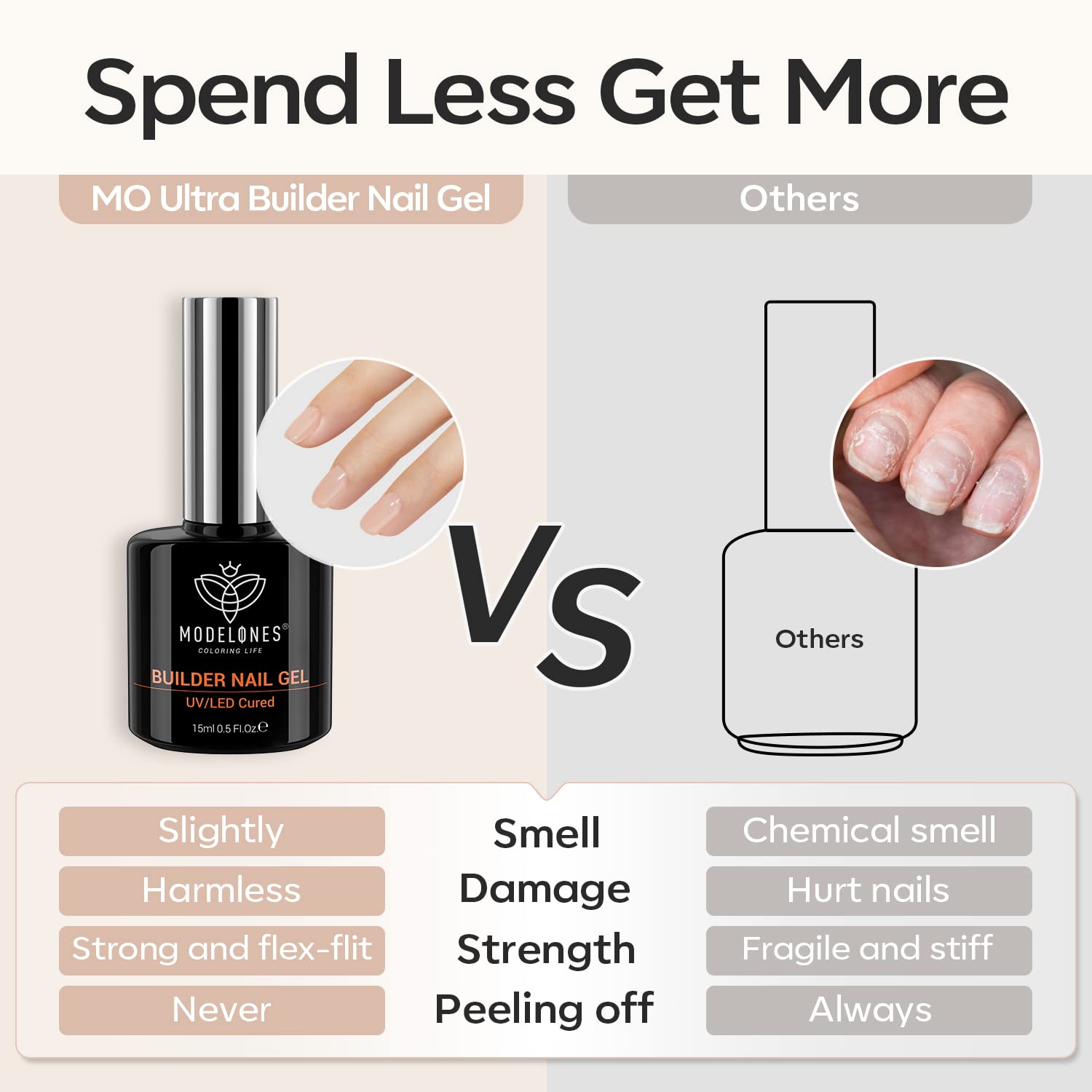 30 Days No Peel-Off & No Bubbles: Modelones nail thickening builder nail gel is made of professional formula, which is adjusted after 72 tests. Say goodbye to air-bubble and peel-off problems. High durability clear gel builder can stay last longer and brings you natural, strong, flexible, and feather-light nails. Long-lasting for 30+ days with with proper application