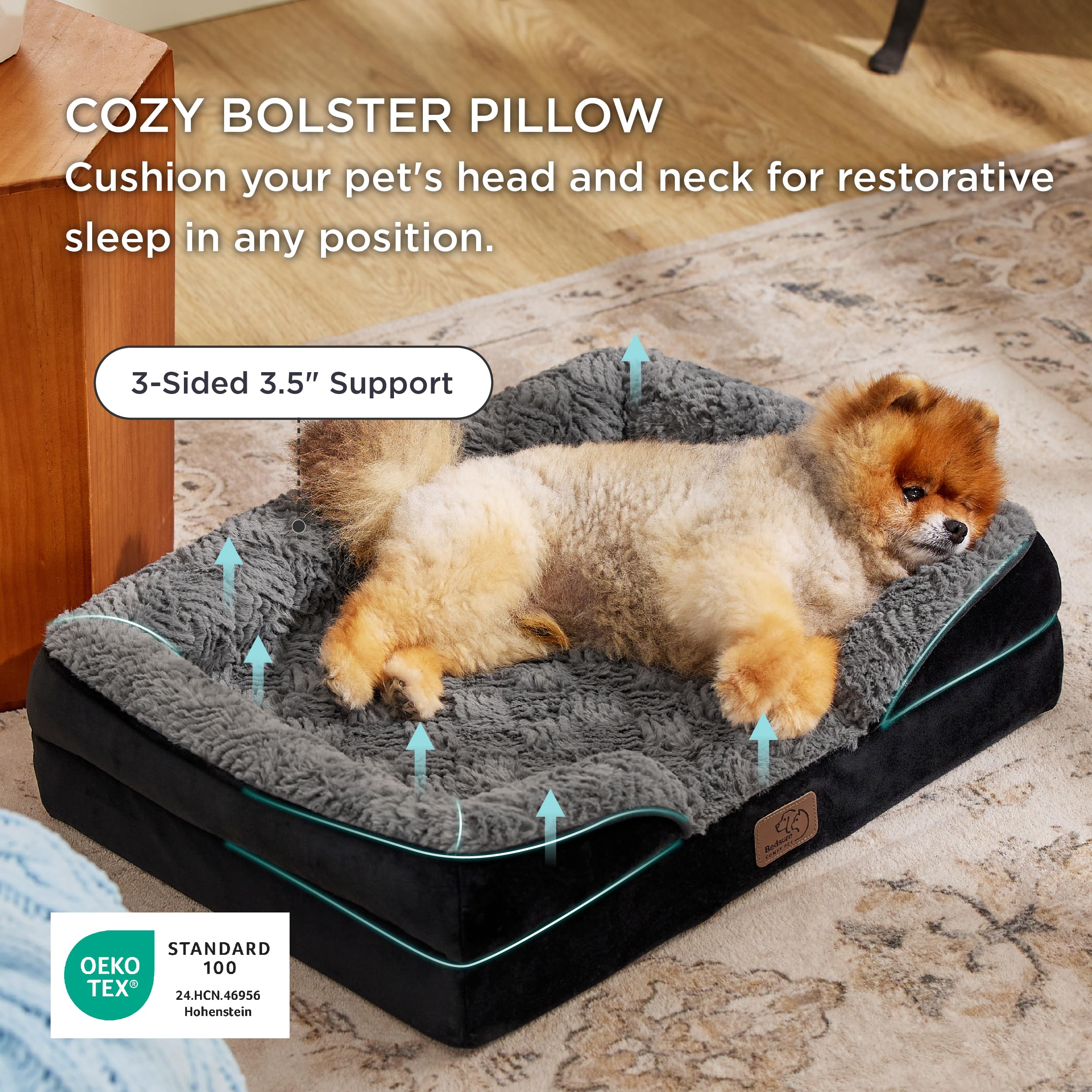 Enhanced Comfort: The 4-sided bolster design promotes ultimate comfort and security, offering your pet a variety of cozy positions to snuggle. The cushioned bolster shape is deeply filled to support your pet’s head and neck for a more restful sleep. And the lowered entrance protects your pet's knees and promotes accessibility.