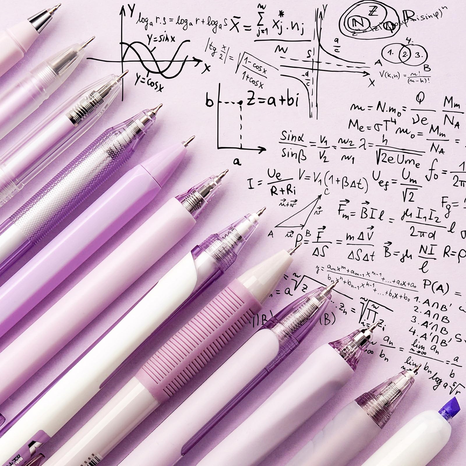 Lavender Aesthetic: Each set includes 12 uniquely patterned pens in chic pastel colors like lavender and purple, crafted for those who love stylish stationery; Includes 10 smooth black gel pens, 1 purple pen, and a purple highlighter