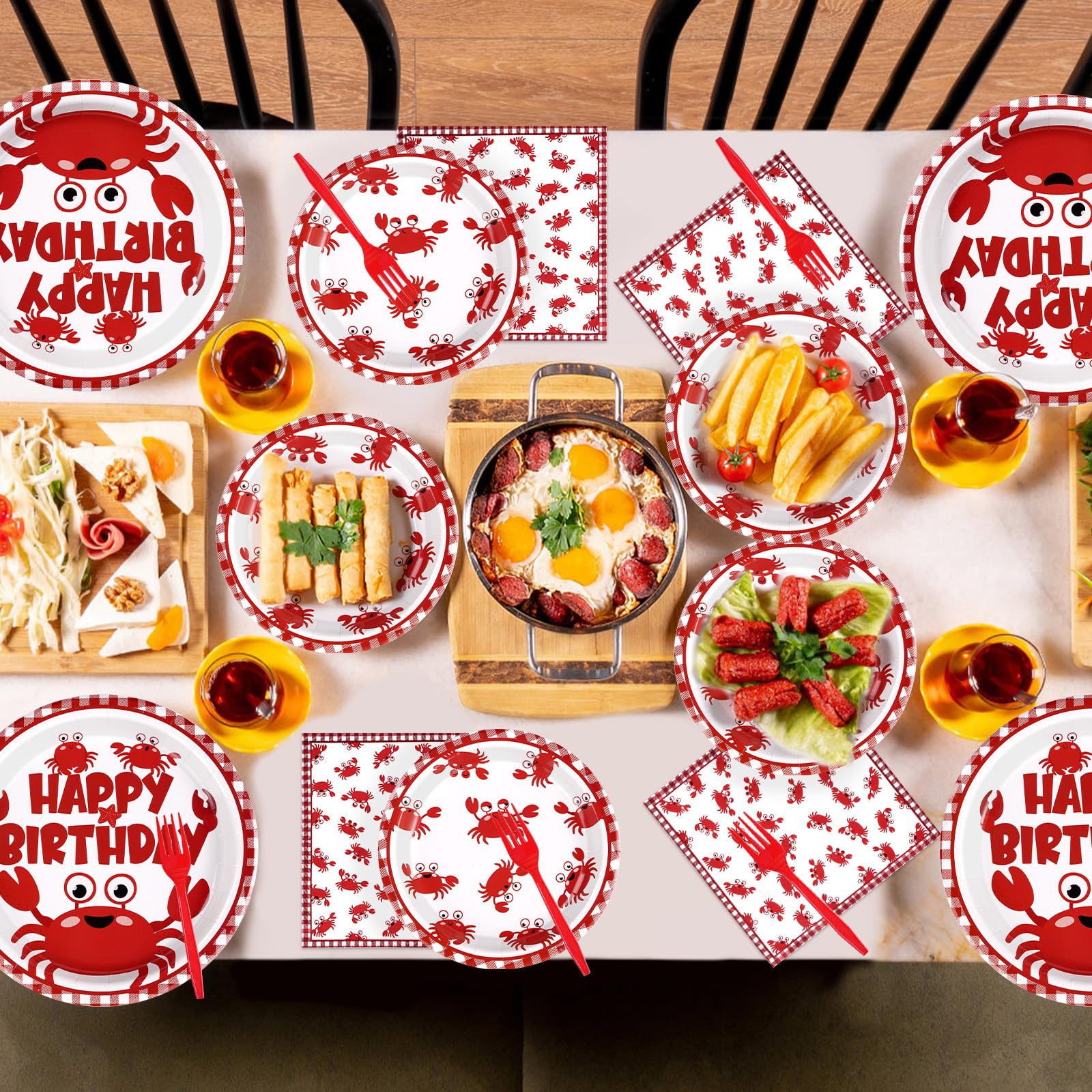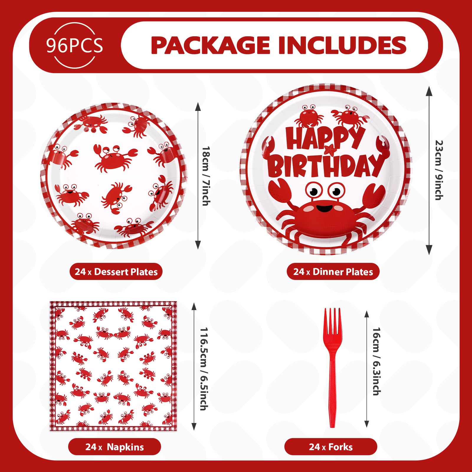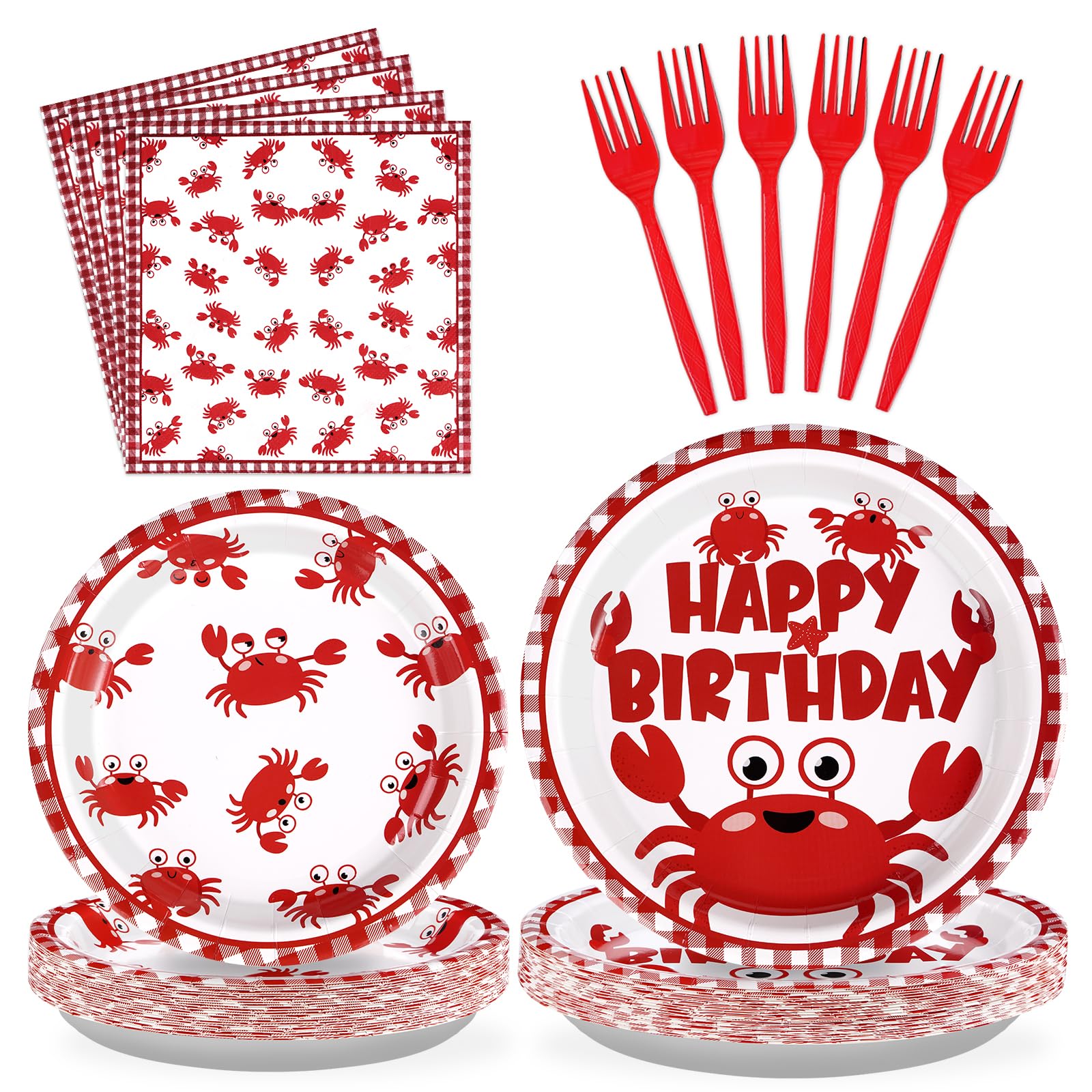 Crab Birthday Party Decorations: Our crab disposable tableware includes 24 9'' crab birthday party plates, 24 7'' crab plates, 24 6.5'' paper napkins, and 24 plastic forks. This crab birthday party decorations kit is specially designed for birthday party. It will definitely be a hit for your special event