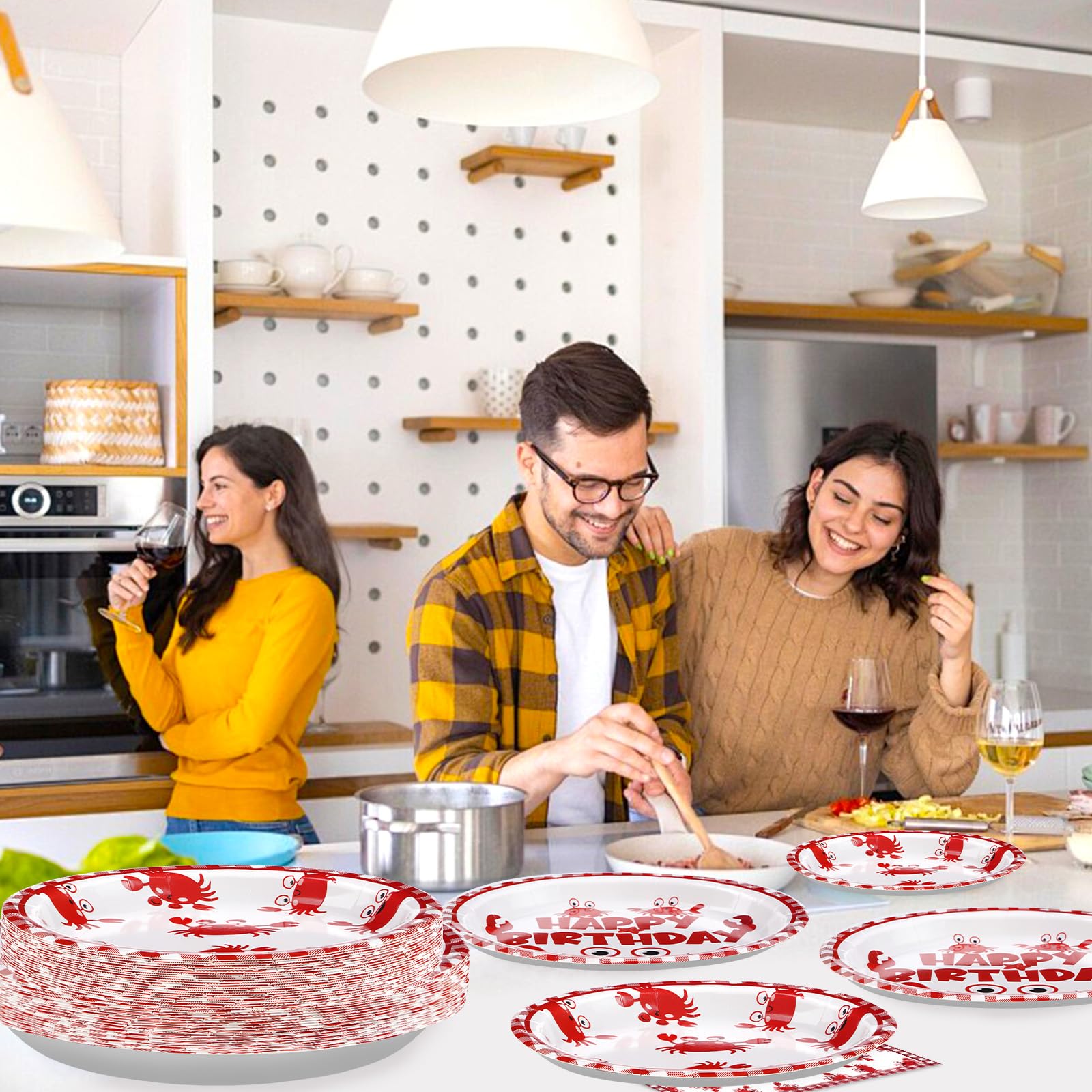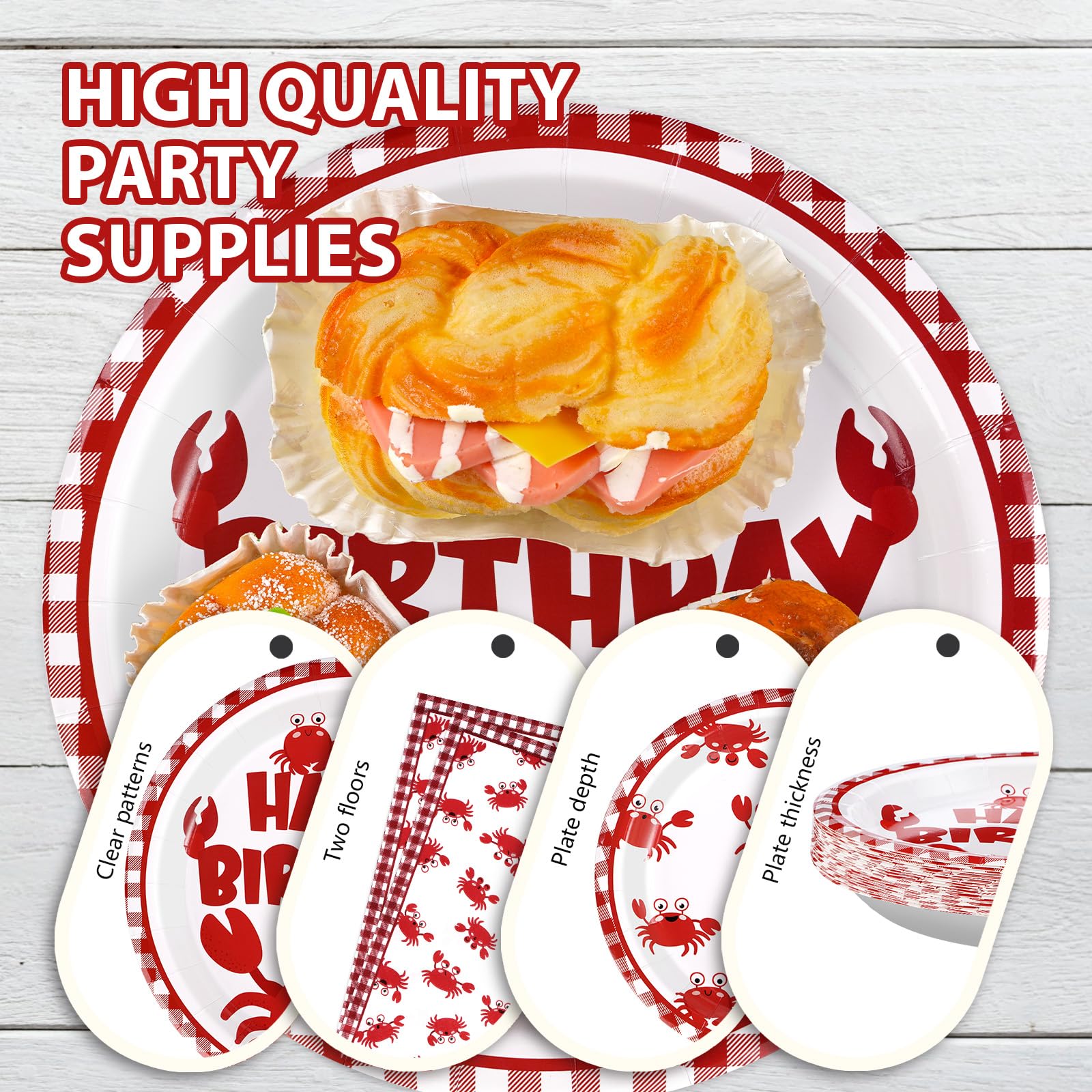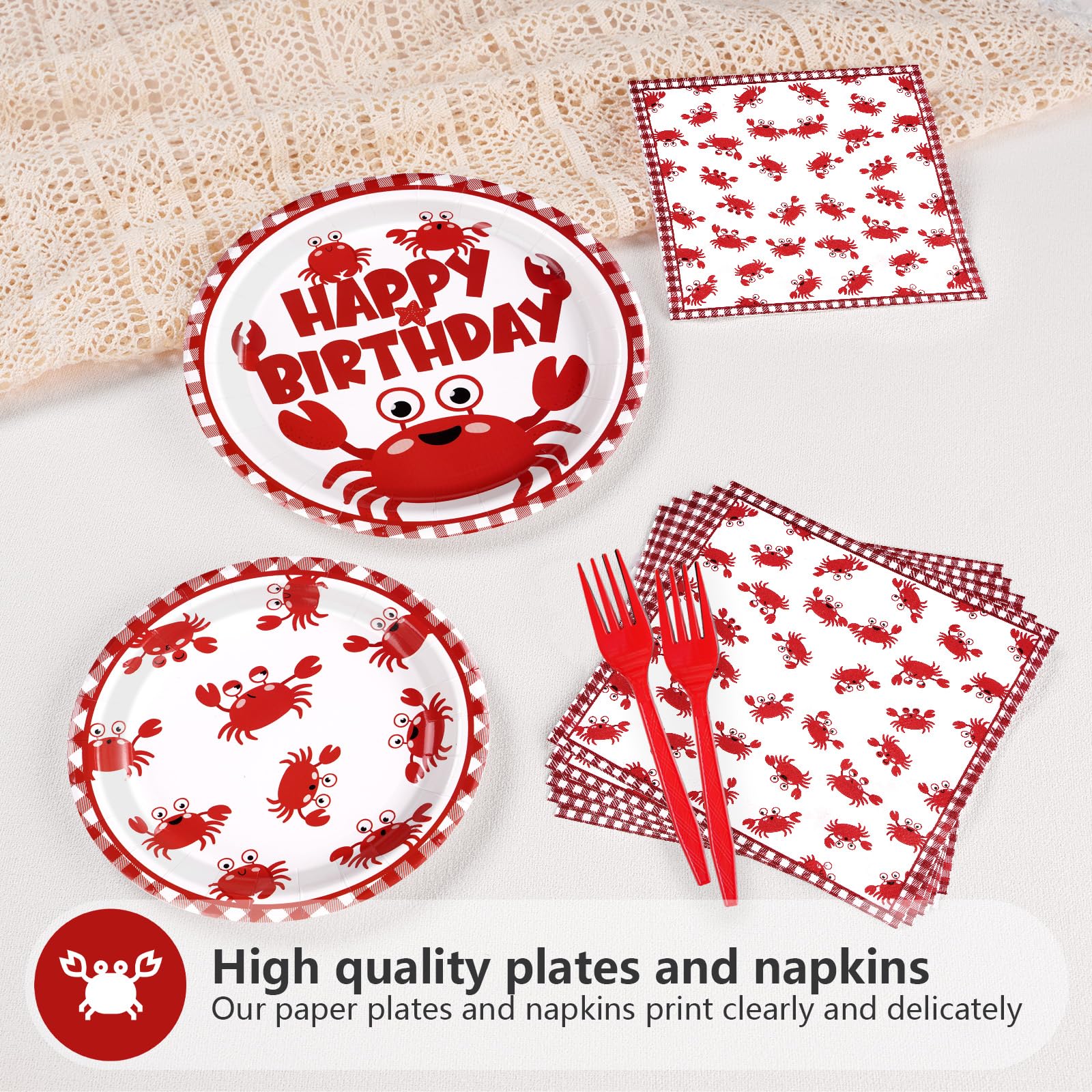 Premium Material: These crab disposable plates are made of heavy duty paper. Crab birthday plates are designed to be strong enough to hold a full plate of food without folding and tearing. Napkins are soft and absorbent to ensure durability (Tips:Please do not microwave these products)