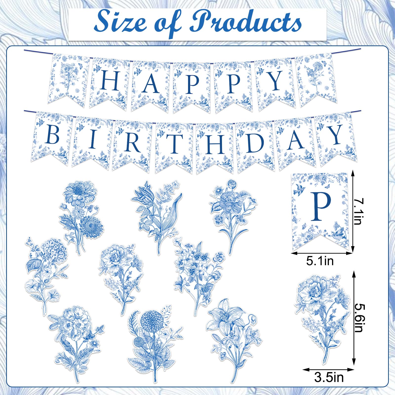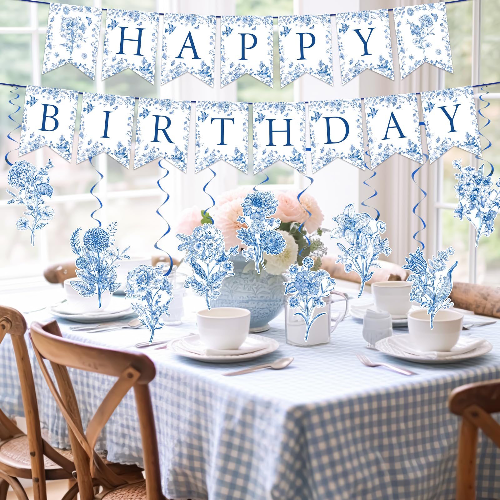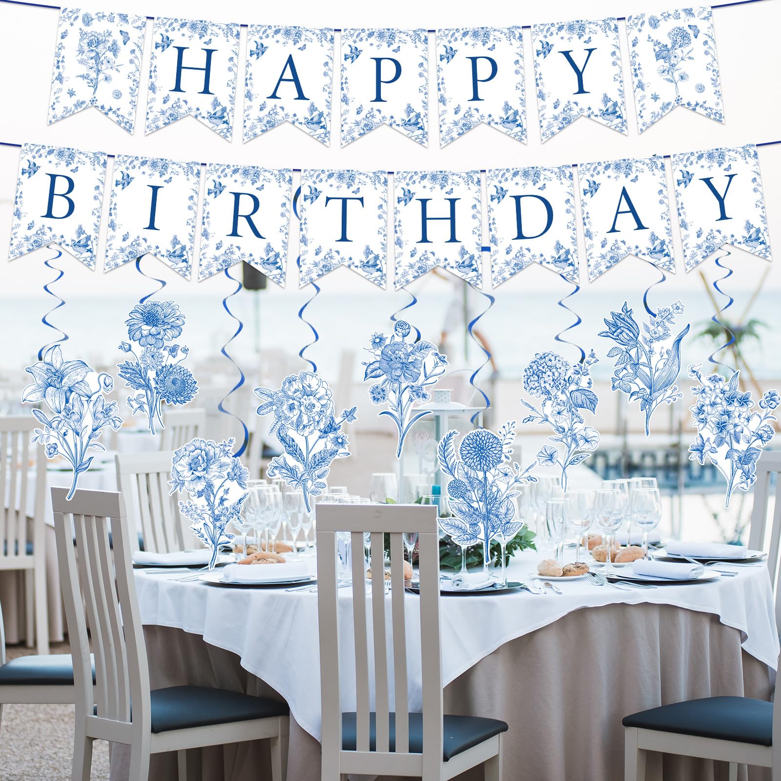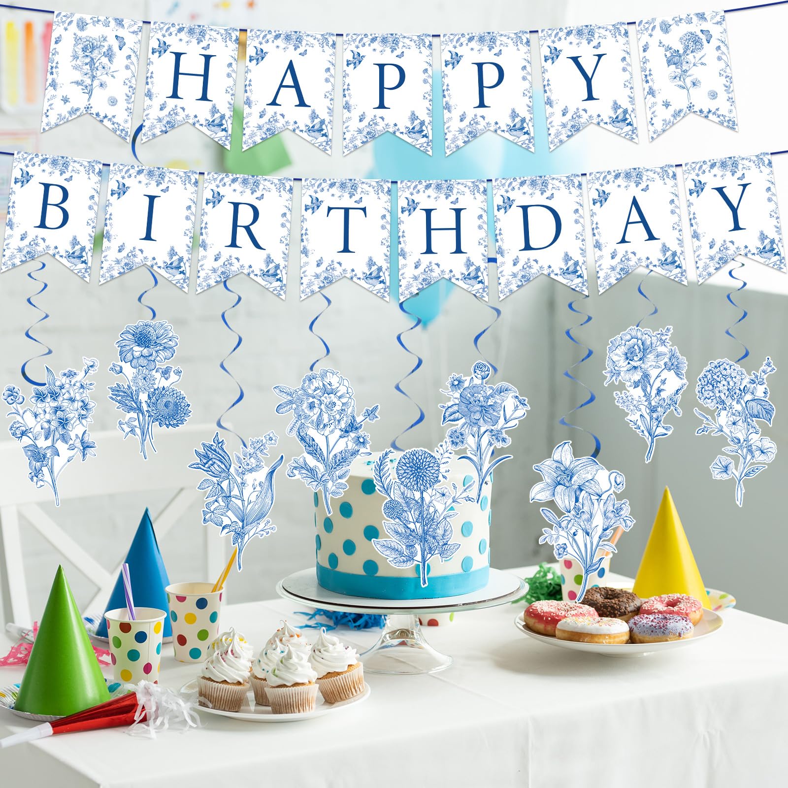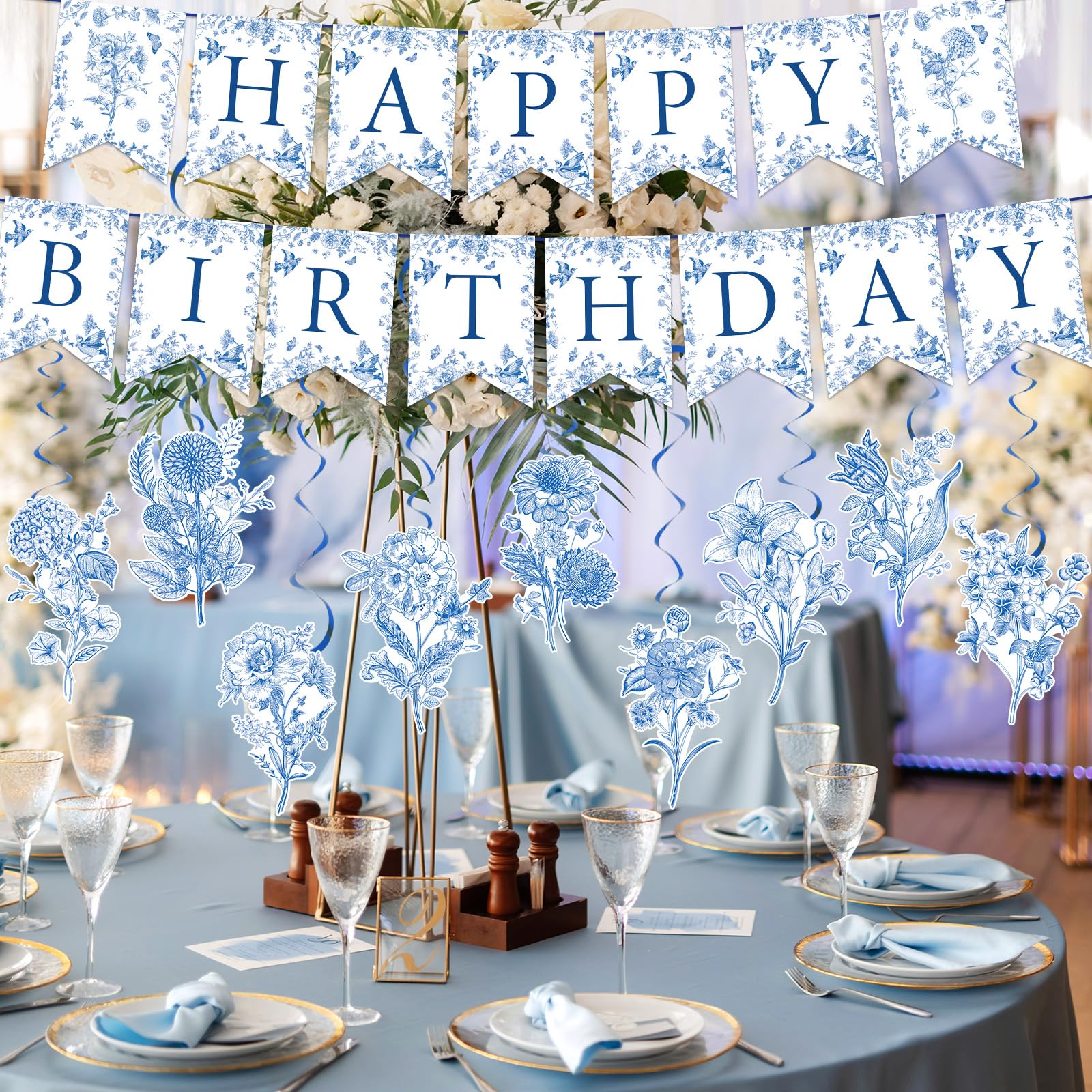 DELICATE DESIGN: Our hanging decoration set features intricate blue flower patterns, exuding an elegant Chinoiserie charm. This set is a perfect backdrop for memorable birthday moments