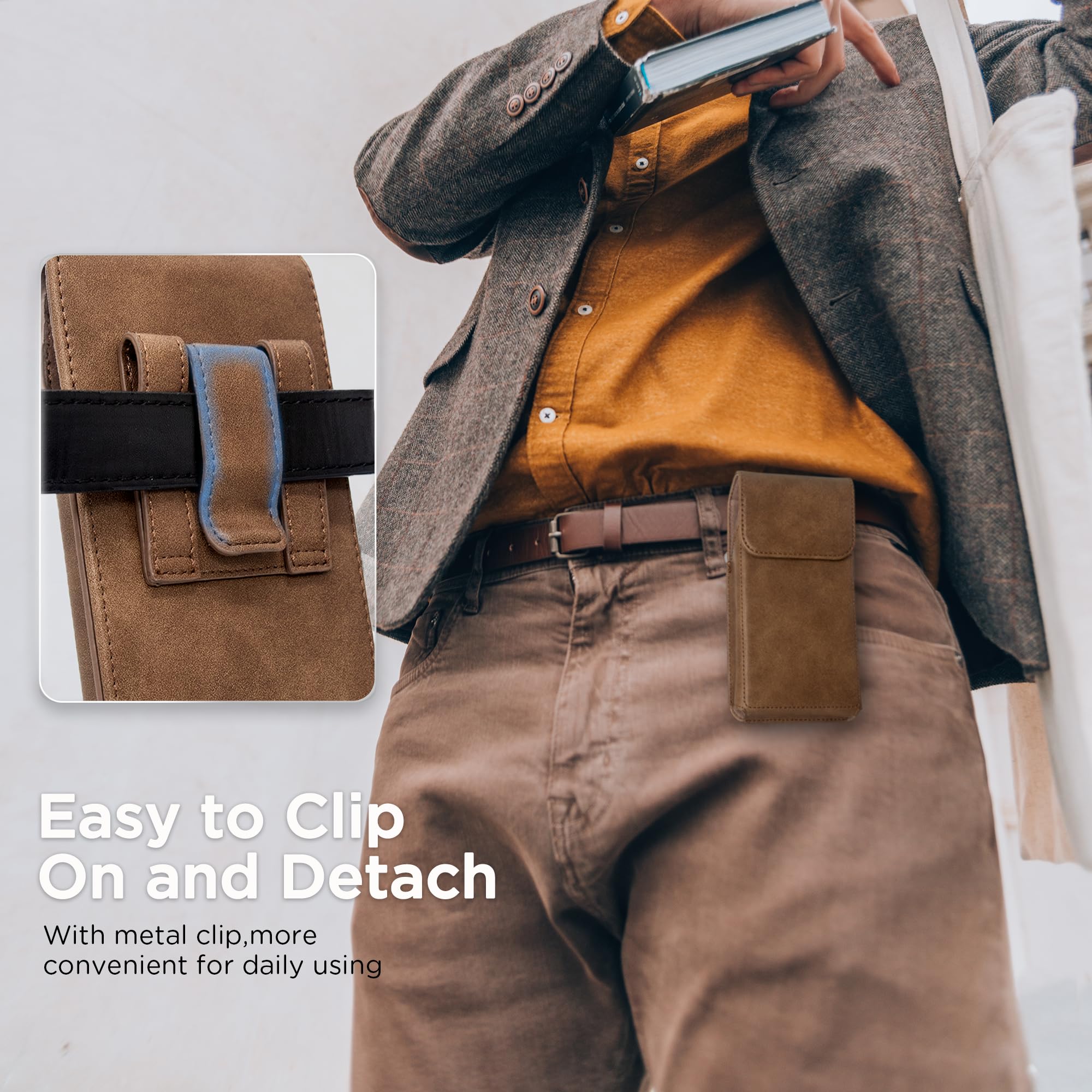 Premium Durable PU Leather: The elegant phone holster is made of high-quality PU leather materials with metal belt clip, which not only shows a stylish and unique texture, but also protects your phone from scratches and damage