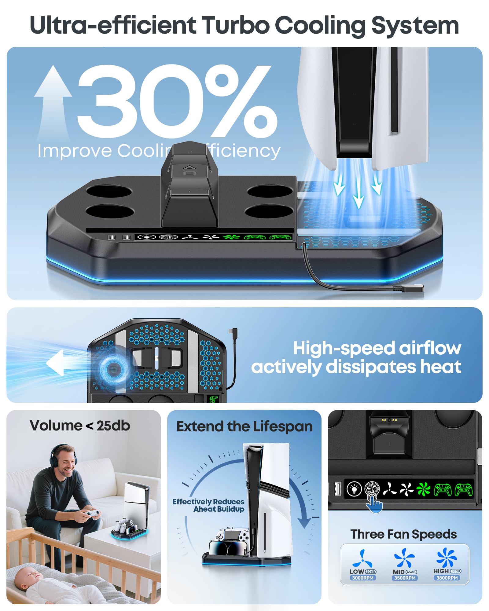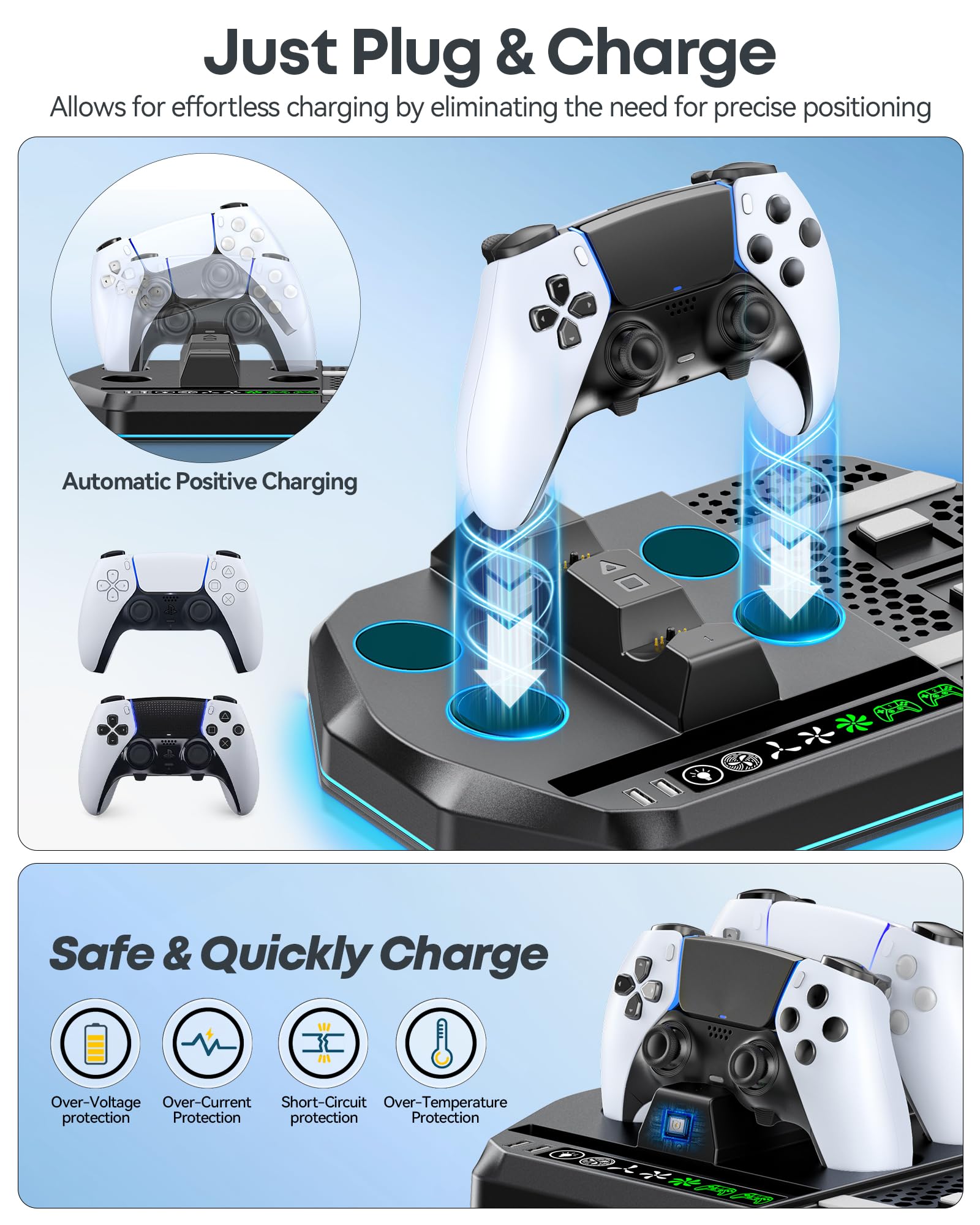 【Upgrade Quadruple Slots Design for Dual Controllers Charging】Featuring four dedicated slots tailored for dual controllers to be placed with their handles facing forward, this PS5 cooling stand with controller charger guarantees stable placement of each charging port. PS5 cooling stand enhances stability throughout the charging process, effectively preventing any vibrations or tilting from interfering with the charging of Dual controllers.