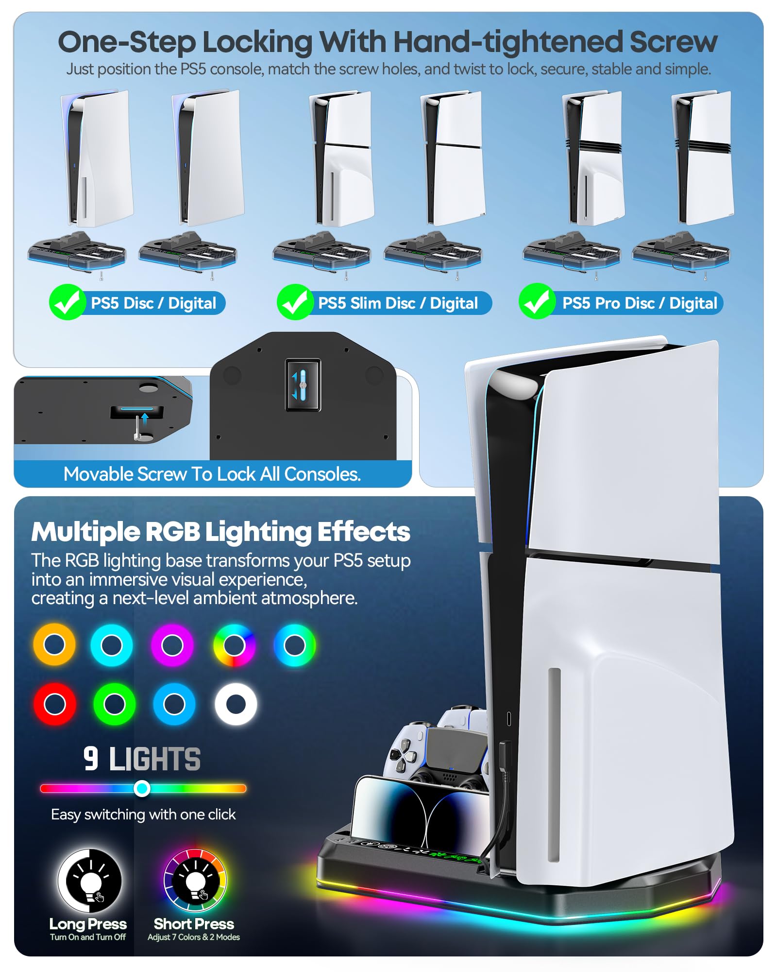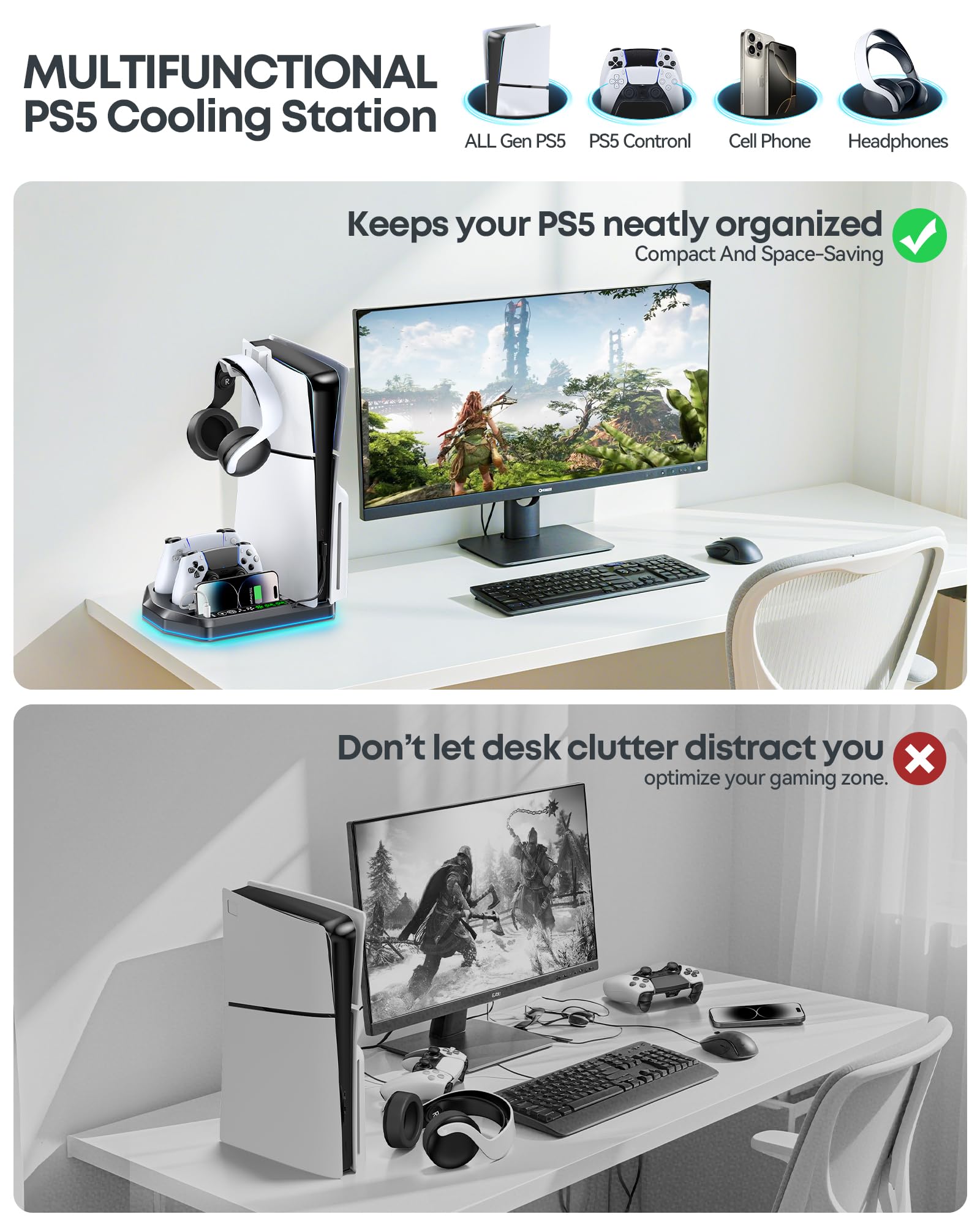 【All Version Adaptability】Compatible with 2024 PS5 PRO & 2023 PS5 SLIM & 2020 PS5 STANDARD DIGITAL & DISC VERSION CONSOLE, PS5 vertical stand intergrates charging, cooling, storing in one place. PS5 dock excels at keeping all PlayStation 5 accessories neatly organized, maintaining a clutter-free setup that elevates your gaming space.
