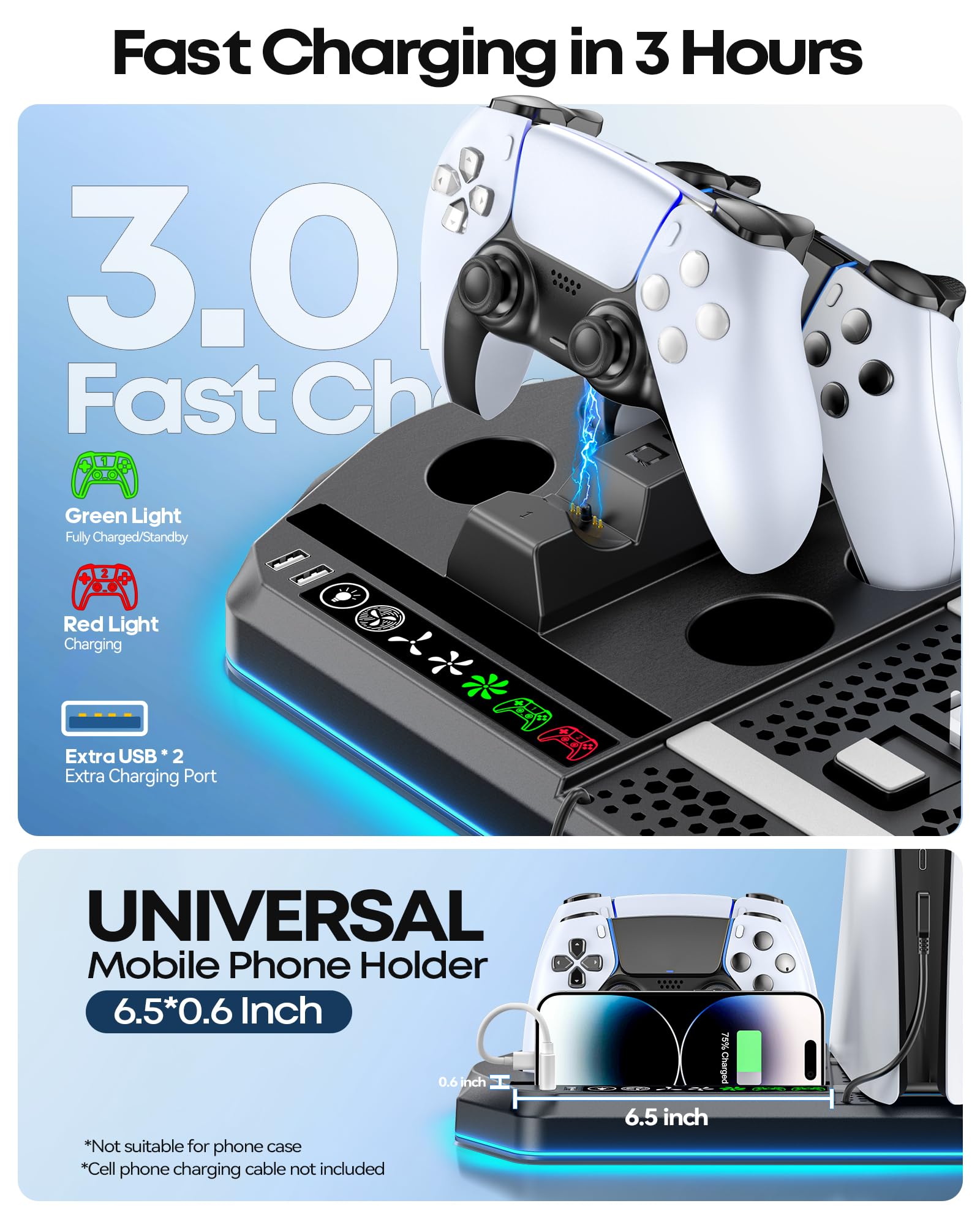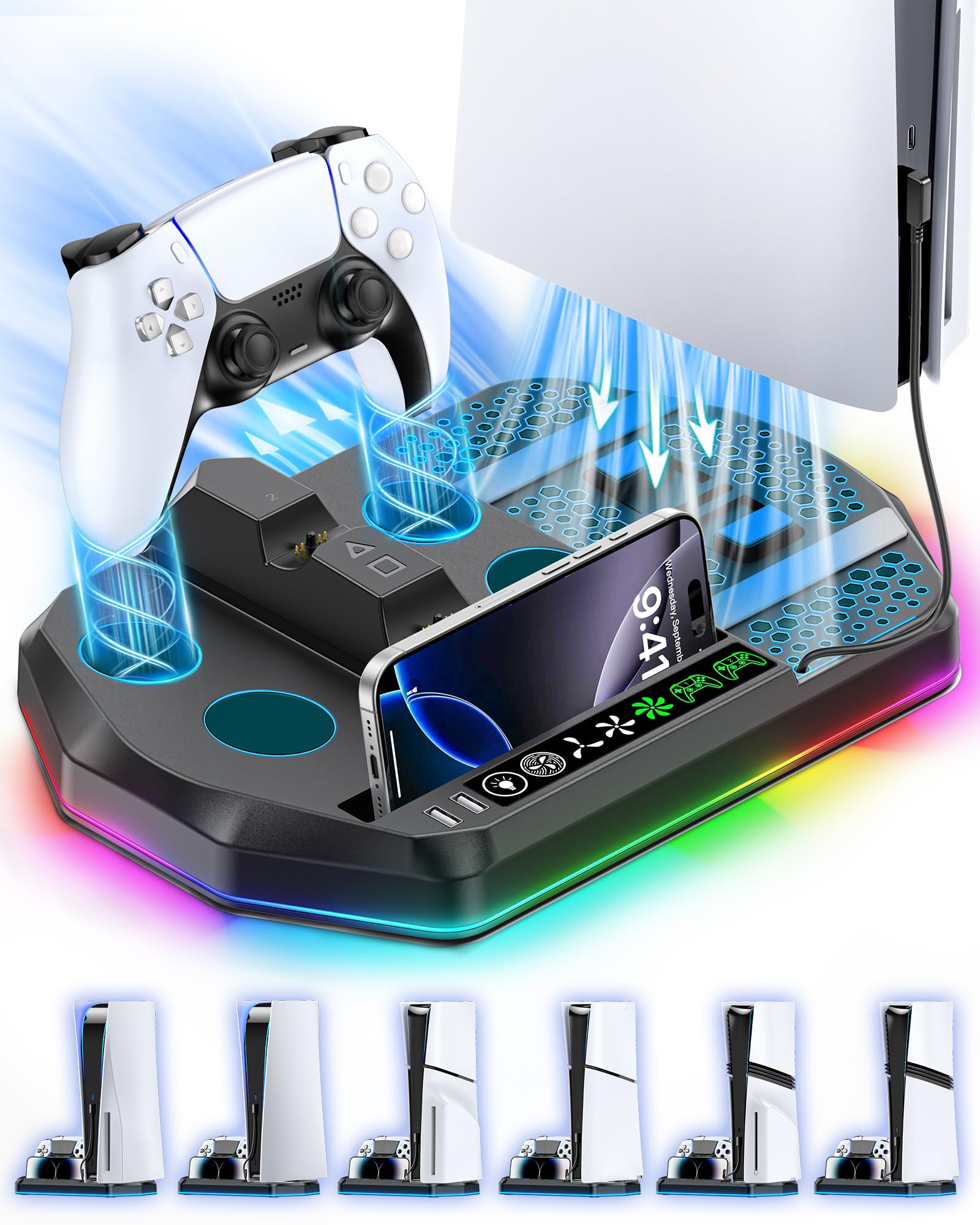【Excellent MINI PS5 Cooling Stand & Storage Kit】 Our mini ps5 cooling system & charging dock integrated playstation 5 stand can easily hold your ps5 slim console, ps5 wireless headset and mobile phone integrated storage and maintain a reasonable and tidy storage space. The mini and compact design for ps5 can reduce space waste and improve storage efficiency. 6.5 Inches phone slot can hold your mobile phone without phone case. Multiple RGB ambient lights can be adjusted in brightness as needed. PS5 controller charger station with digital LED Indicators. The RGB lights equipped with a memory mode to fit your usage habits.
