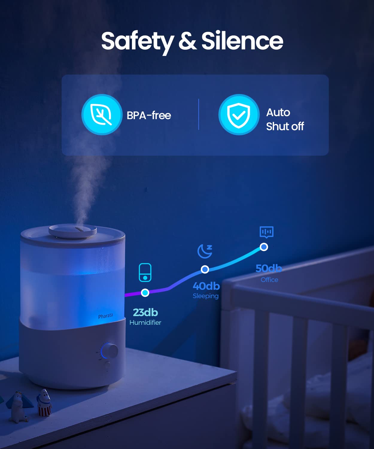WHISPER-QUIET & COLORFUL NIGHTLIGHT:23 dB quiet operation does not disturb baby to sleep peacefully. Color night light multiple color display, make your night full of romantic atmosphere relaxation, independent switch for separate use.