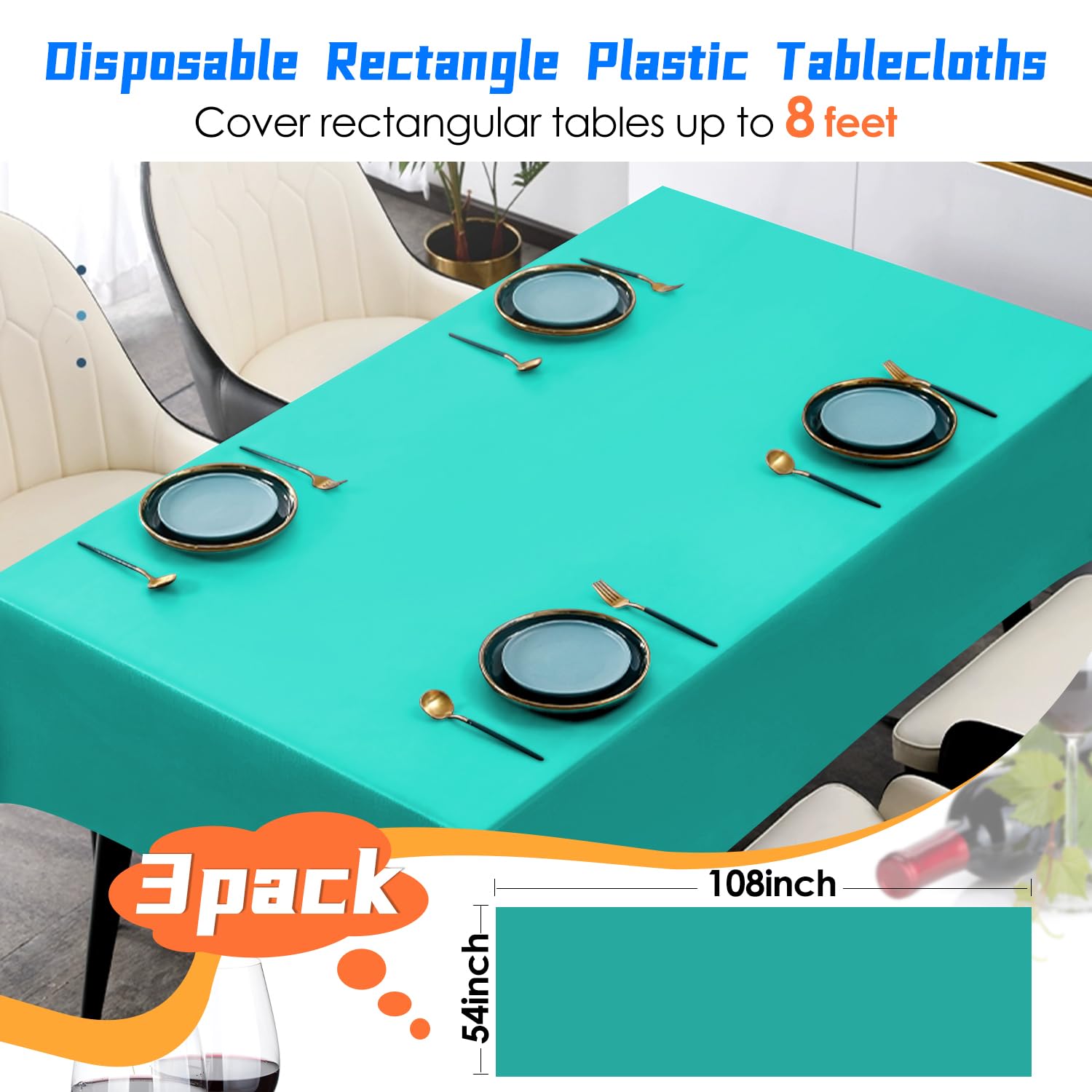 Premium: These plastic tablecloths are made of heavy and high-quality plastic, 54"x 108" rectangle plastic table cloth covers most rectangular tables up to 8 feet and enjoy a nice partytime.