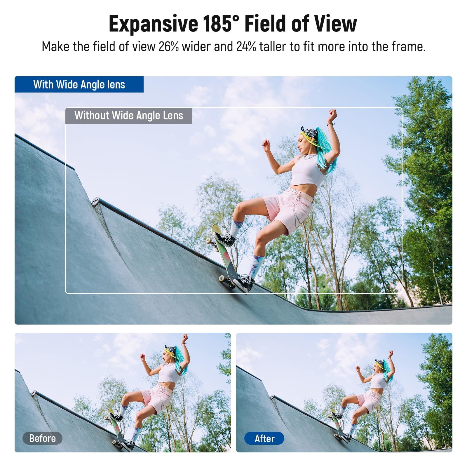 【Wide Angle Lens with 185° FOV】 The wide angle lens expands the field of view (FOV) to 185° and creates a slightly distorted effect for creative shots, perfect for landscape, street photography, and group portraits. Its highly transmissive aspherical lens construction delivers exceptional clarity