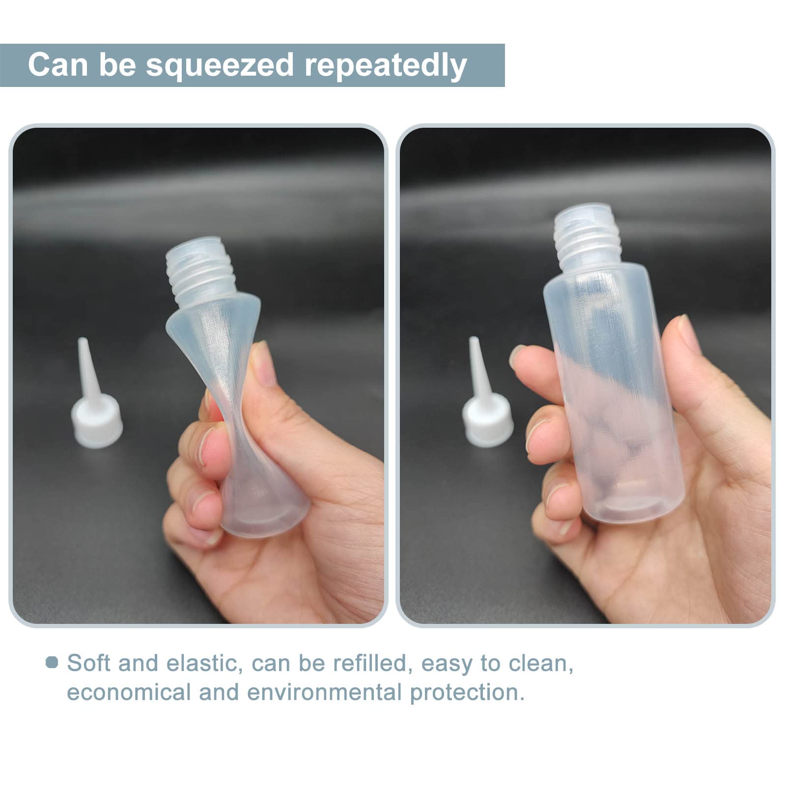 The squeeze bottle is made of high-quality PE, which is environmentally friendly and non-toxic, small and light, elastic, soft, and easy to squeeze.
