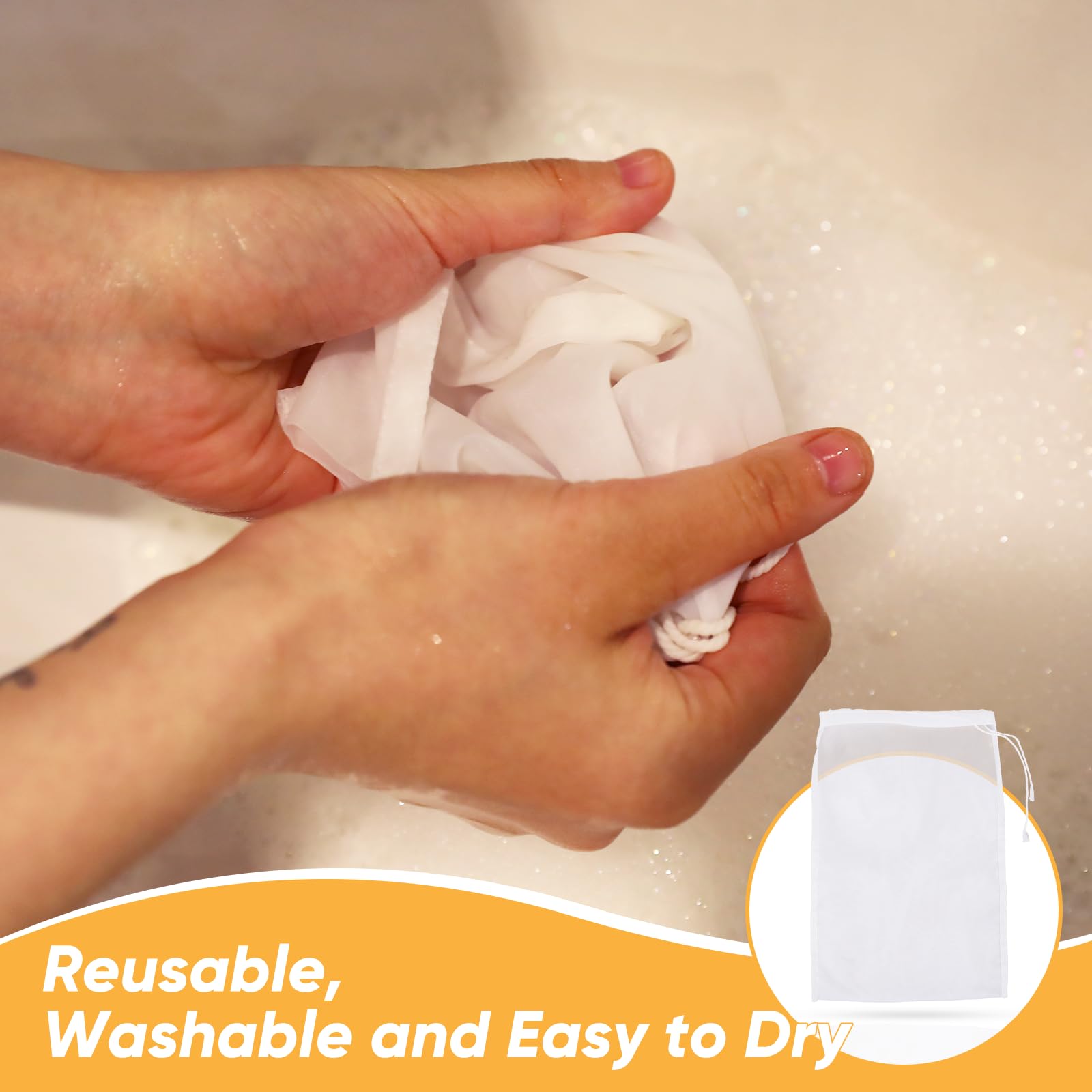 Fine Design: These reusable cheese cloths for straining are finely designed, easier to squeeze and filter, which can provide you with fast and fine filtration. The fine seams make these nut milk bags easier to clean, making your cooking healthy and convenient.