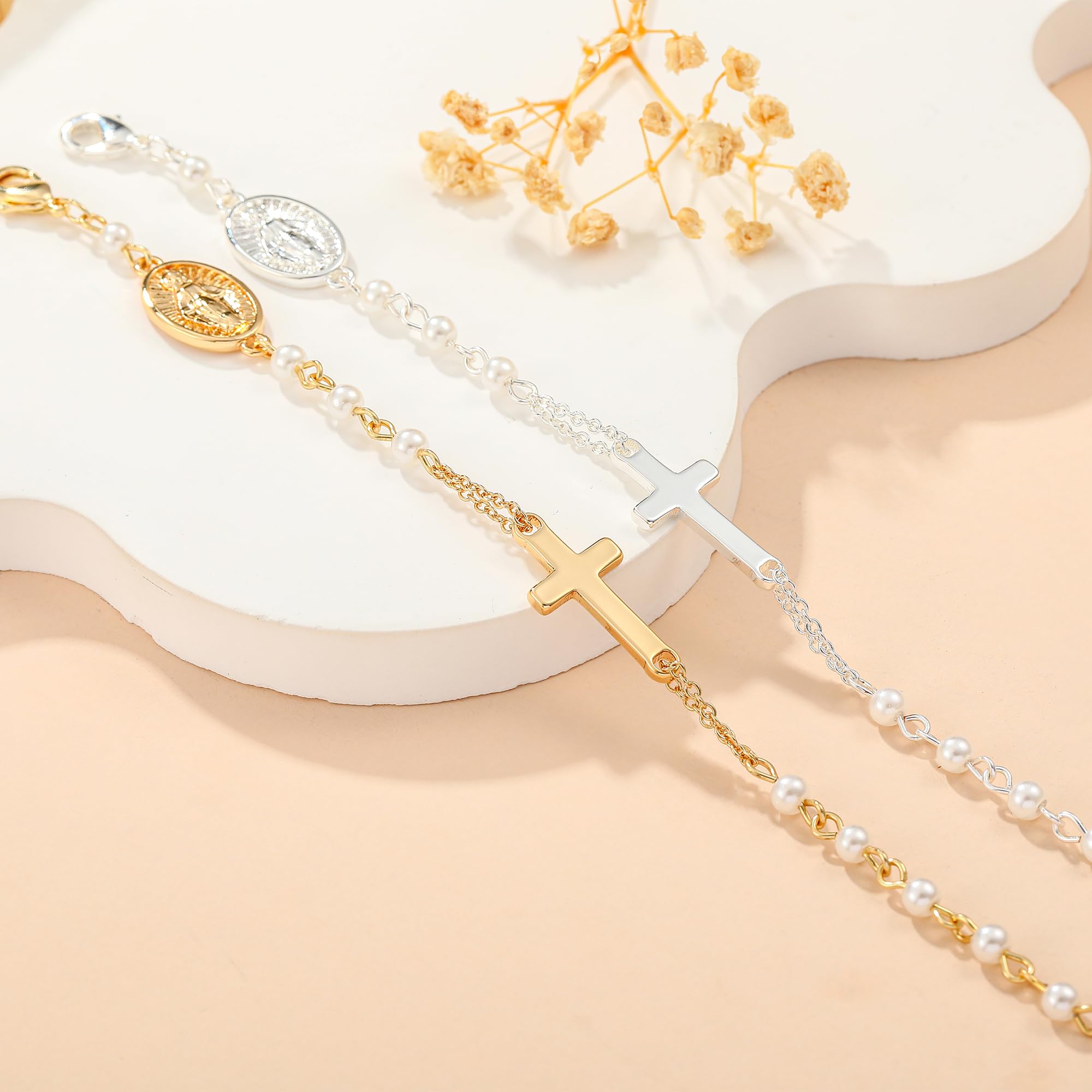 [Material] The catholic bracelet is made of brass with 14k gold plated, and select full-grained glass simulated pearls, no stimulation to the skin and comfortable to wear.