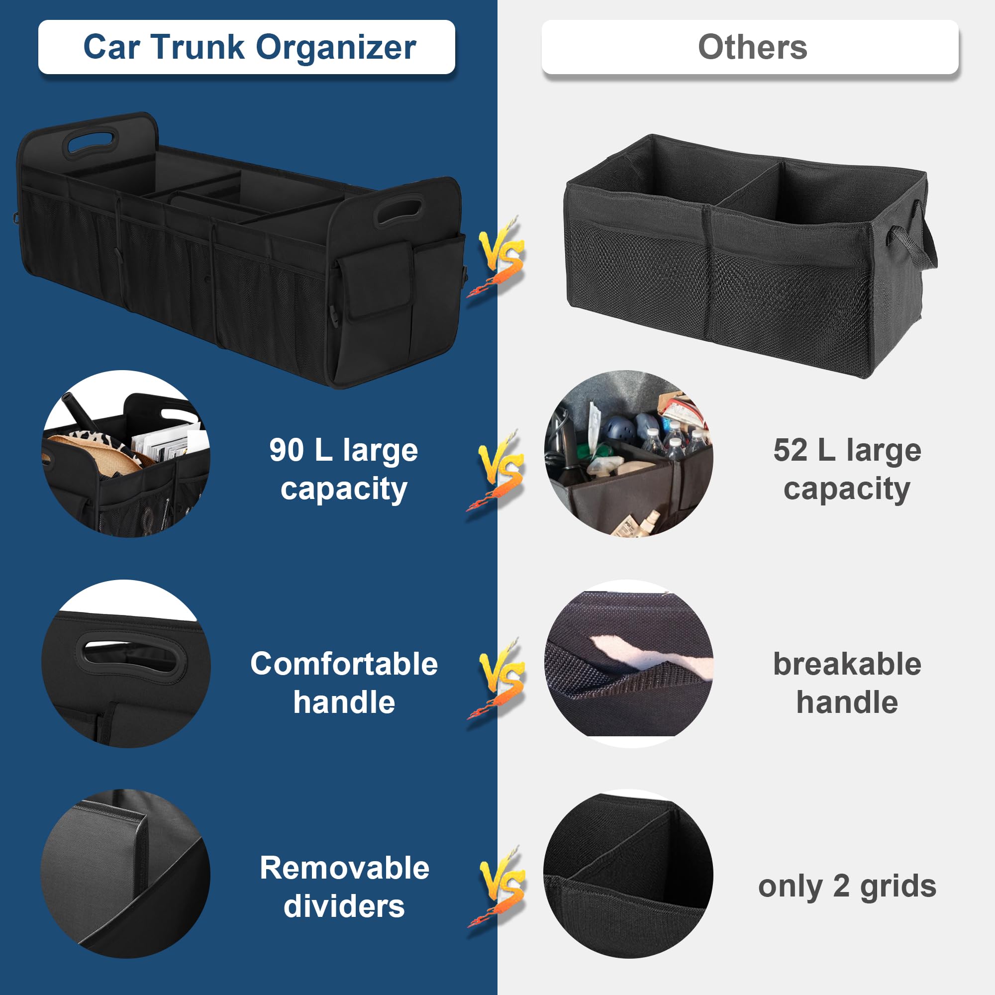 【Large Capacity Trunk Organizer】: Upgrade the car trunk organzier capacity. Most of the car organizers in the market have a capacity of 50L-60L, but our trunk organizer has a capacity of 90L, which is 30L-40L more than similar trunk oganizers.