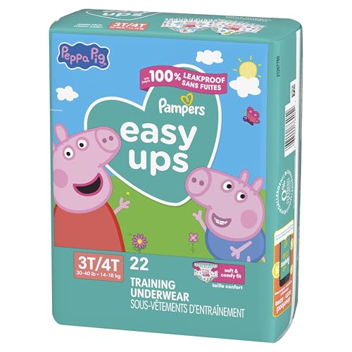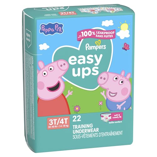 Make potty-training easy and fun with Pampers Easy Ups Potty Training Underwear for Girls and Boys! Featuring your favorite characters - Bluey and Peppa Pig - these super soft, comfortable, and breathable training pants fit just like real cotton underwear giving your toddler the confidence to feel like they have transitioned out of diapers! With a 360 stretchy waistband that is gentle on your child's skin, Easy Ups make it easy for your toddler to pull up and down their training pants independently. For easy changing, Easy Ups feature easy tear sides for mess-free convenience, even on the go! When it comes to potty training accidents, your toddler will be covered with up to 100% leakproof protection Day OR Night. To protect where leaks happen most, Easy Ups are made with Dual Leak-Guard Barriers around the leg cuffs and Extra Absorb Channels for all around coverage to absorb accidents and lock them away from your toddler's skin. Plus, they're dermatologically tested, hypoallergenic, and free of parabens and latex.* That's just one of the many reasons Pampers is the #1 pediatrician recommended brand. Available in sizes 2T-3T (16-34 lb), 3T-4T (30-40 lb), 4T-5T (37+ lb) and 5T- 6T (41+ lb). *No natural Rubber