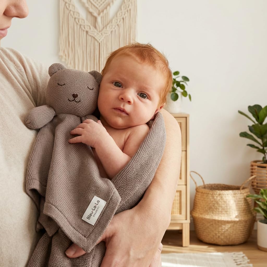 A Cozy Blanket and Lovey Set: This sweet set includes a soft knit baby blanket and a cuddly lovey security blanket, both made from gentle organic cotton that feels soft and comforting against delicate newborn skin.