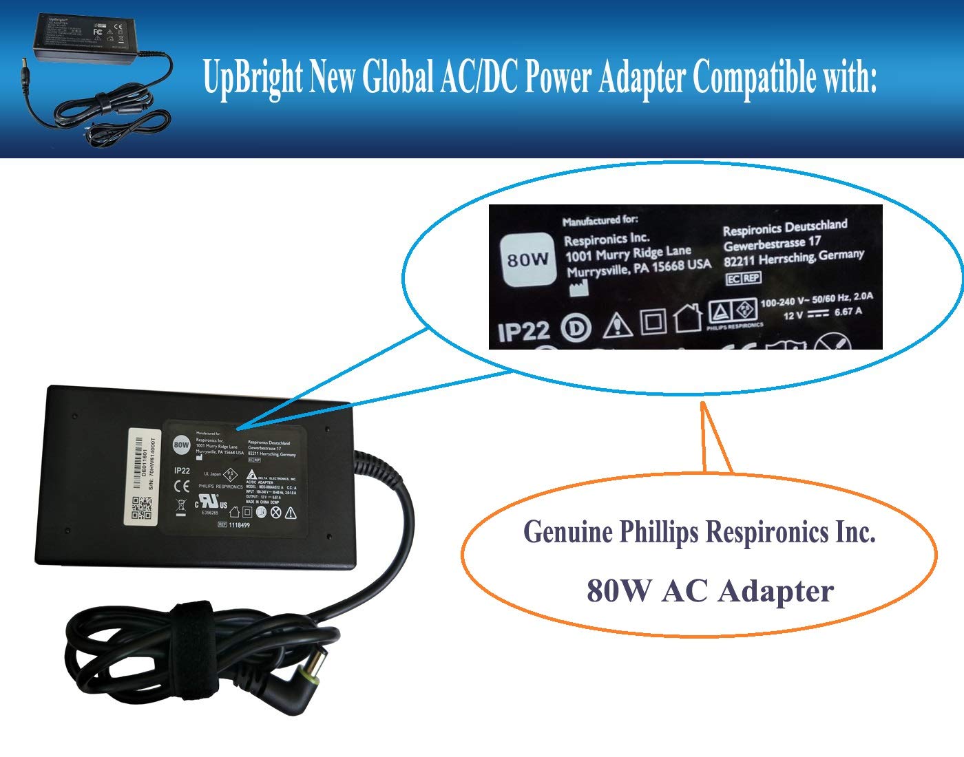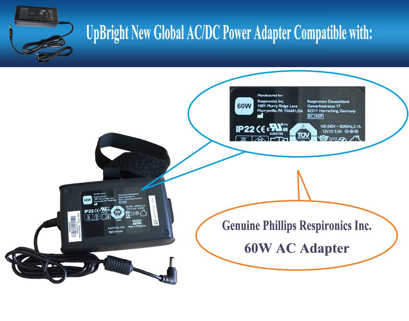 UpBright New Global 60W 12V AC / DC Adapter Compatible with Philips Respironics PR REMstar C-Flex AA24750L-003 MW115RA1200N09 REF 1091398 1091389 System One 60 Series CPAP APAP BIPAP REMstar Pro DOM REF 460P humidifier IP22 ASTEC 12V 4.16A 5.0A 6.67A 50W 60.0W - 80W 12 V 5.0 A 6.67 A 60 W 80 W 12VDC 5A 12.0V 5000mA 6670mA 60 - 80 Watt SL Switching Power Supply Cord Cable Battery Charger Mains PSU