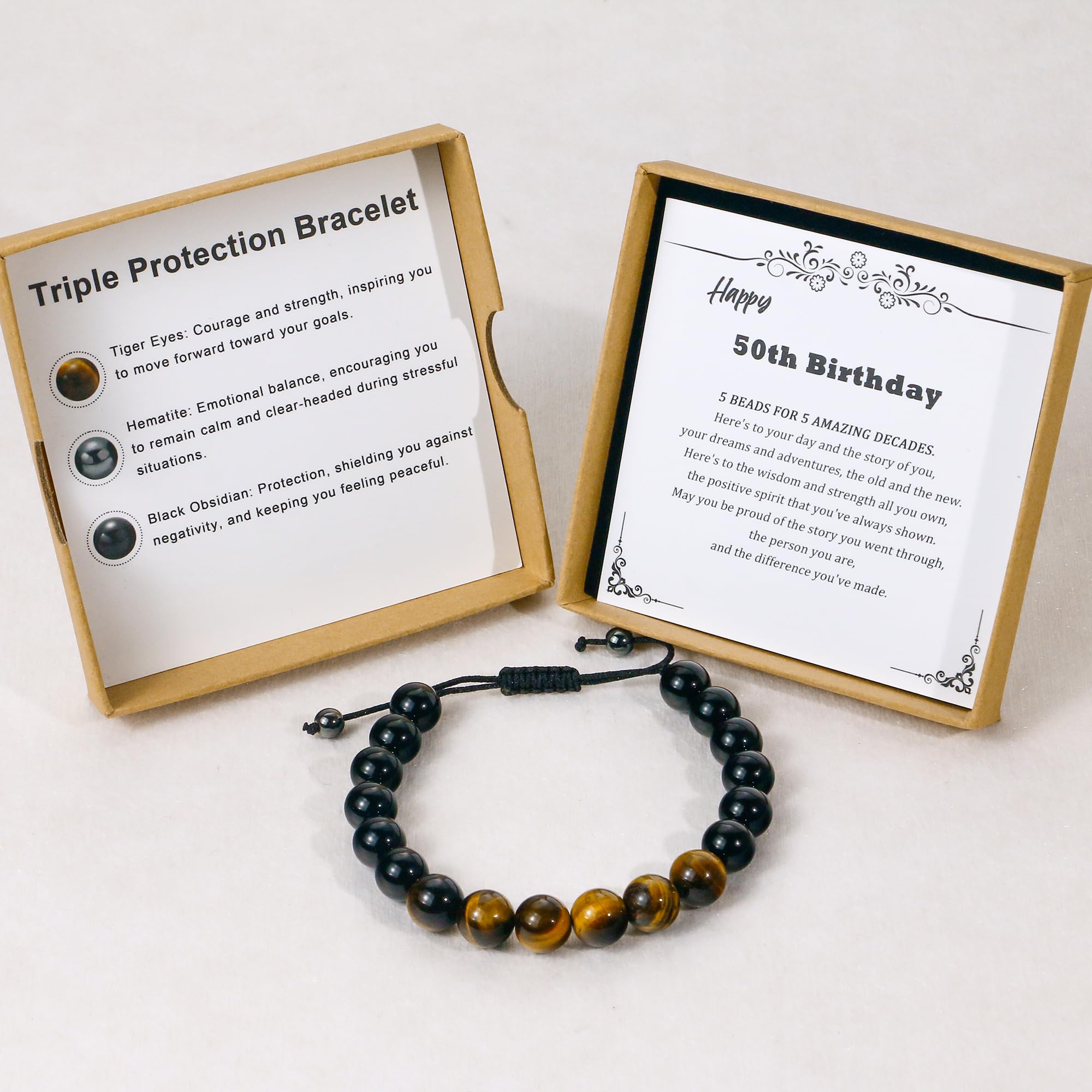 50th Birthday Gift Ideas: Obsidian and tiger's eye as well as hematite have been used to protect people from negative effects and bring good luck. Give him this good wish on his 50th birthday, and every time he sees this bracelet,he remembers that your love is by his side.