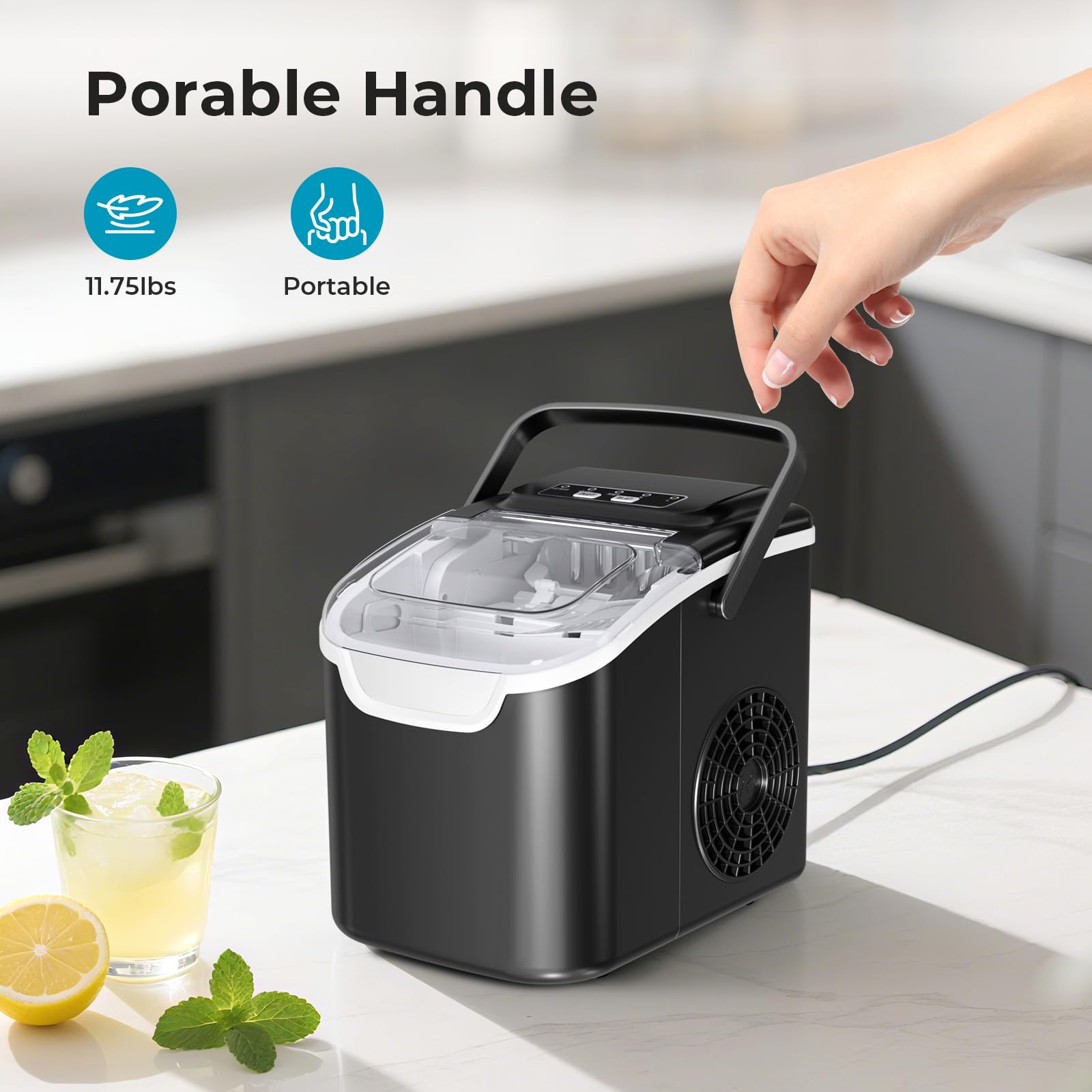 Ultra-Portable & Space-Saving:Compact 12" design fits dorm rooms/office counters. Built-in handle and 2.4L water tank make this electric ice machine ideal for RVs, camping, or outdoor events.