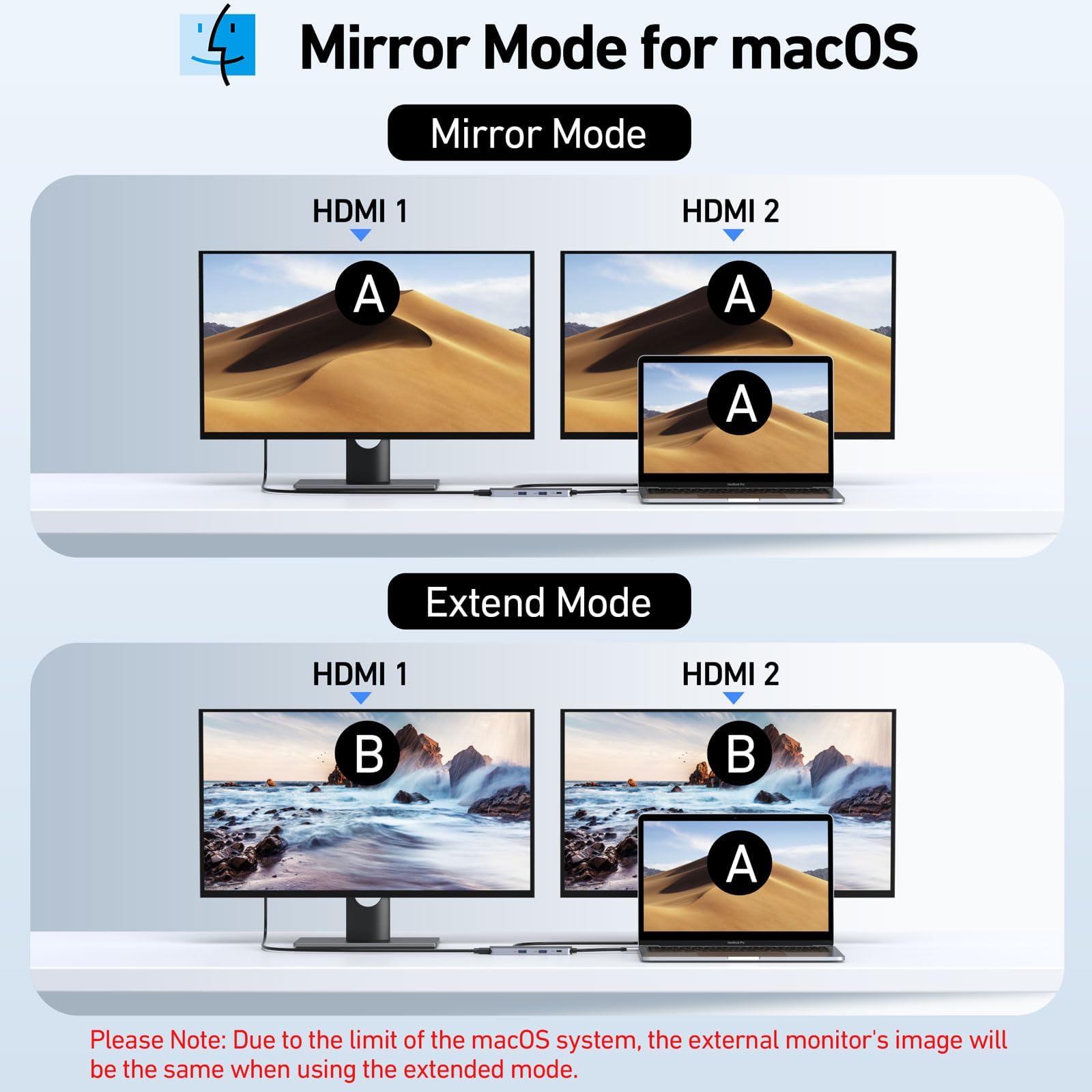 [Dual Monitors Made Easy for DP1.4 Laptop] Note for Mac Users: This adapter only supports mirror mode (repeated display), dual screen extension with two different screens (MST) is not available on macOS! With our advanced intelligent technology, the 2 HDMI to USB C adapter provides temperature control and stable performance. Boost productivity with our usb c dual hdmi supporting MST mode under Windows Laptop for extending two monitors simultaneously
