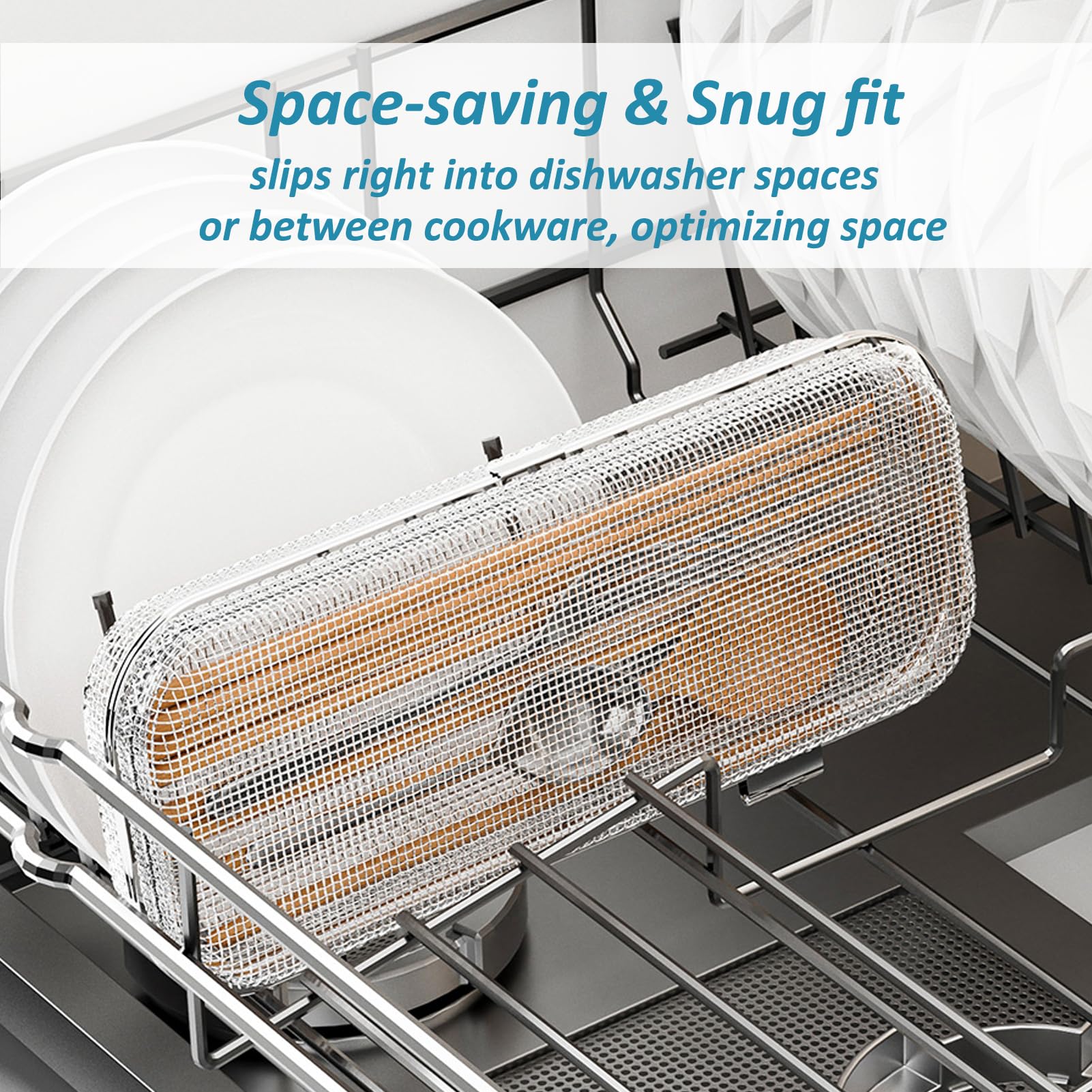 Custom-fit dimensions 10.8"x4.5"x1.78" slots between any dishwasher racks. Holds 15+ utensils while saving 40% space for pots – ideal for compact kitchens