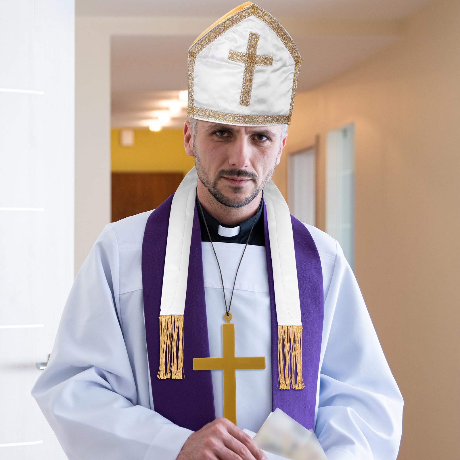 Halloween Pope Style: pope hat for men, walking stick and cross necklace are nice additions to dress up as a pope or priest, made of polyester and plastic, our hat is exquisitely crafted, you can wear them to cosplay a pope, or pair them with other pope costume men accessories to complement your halloween look