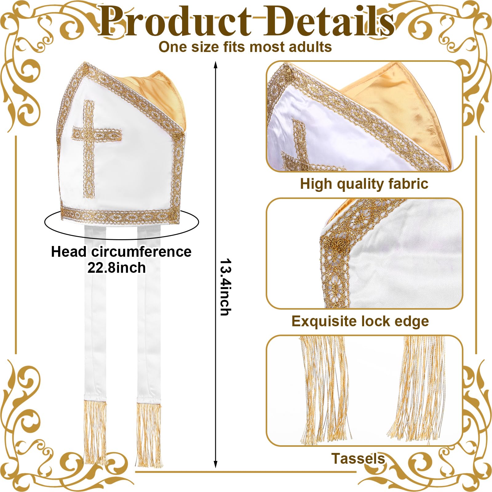 Durable and comfortable: our white pope hat is made from durable and quality polyester fabric, accented with a shining gold cross and gold lace, sized fits most adults. Flat size approx 10.4 inch tall by 13 inch wide