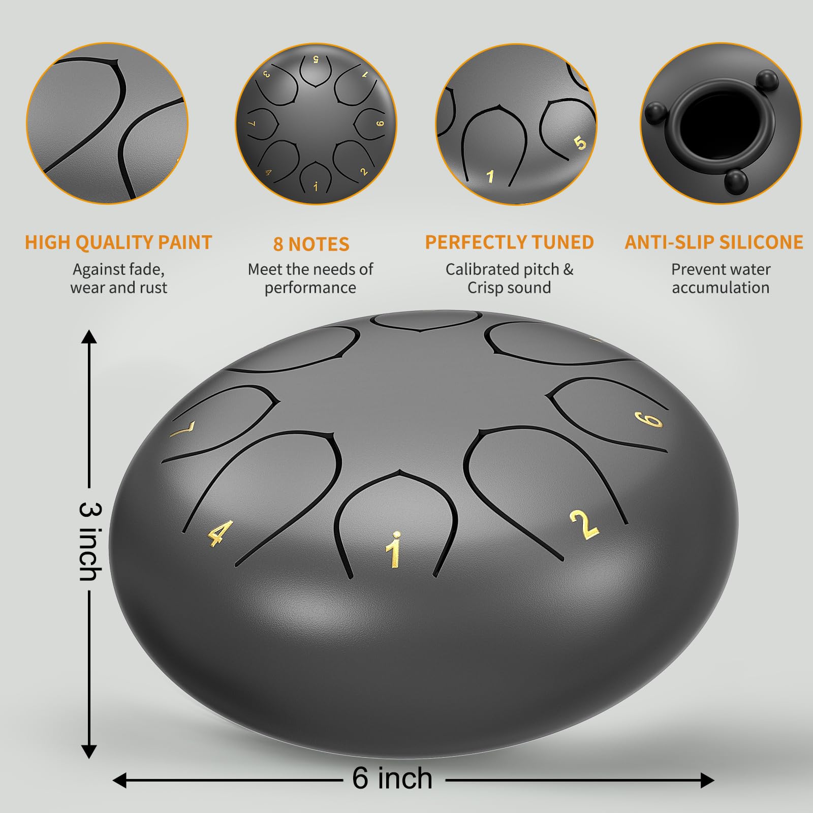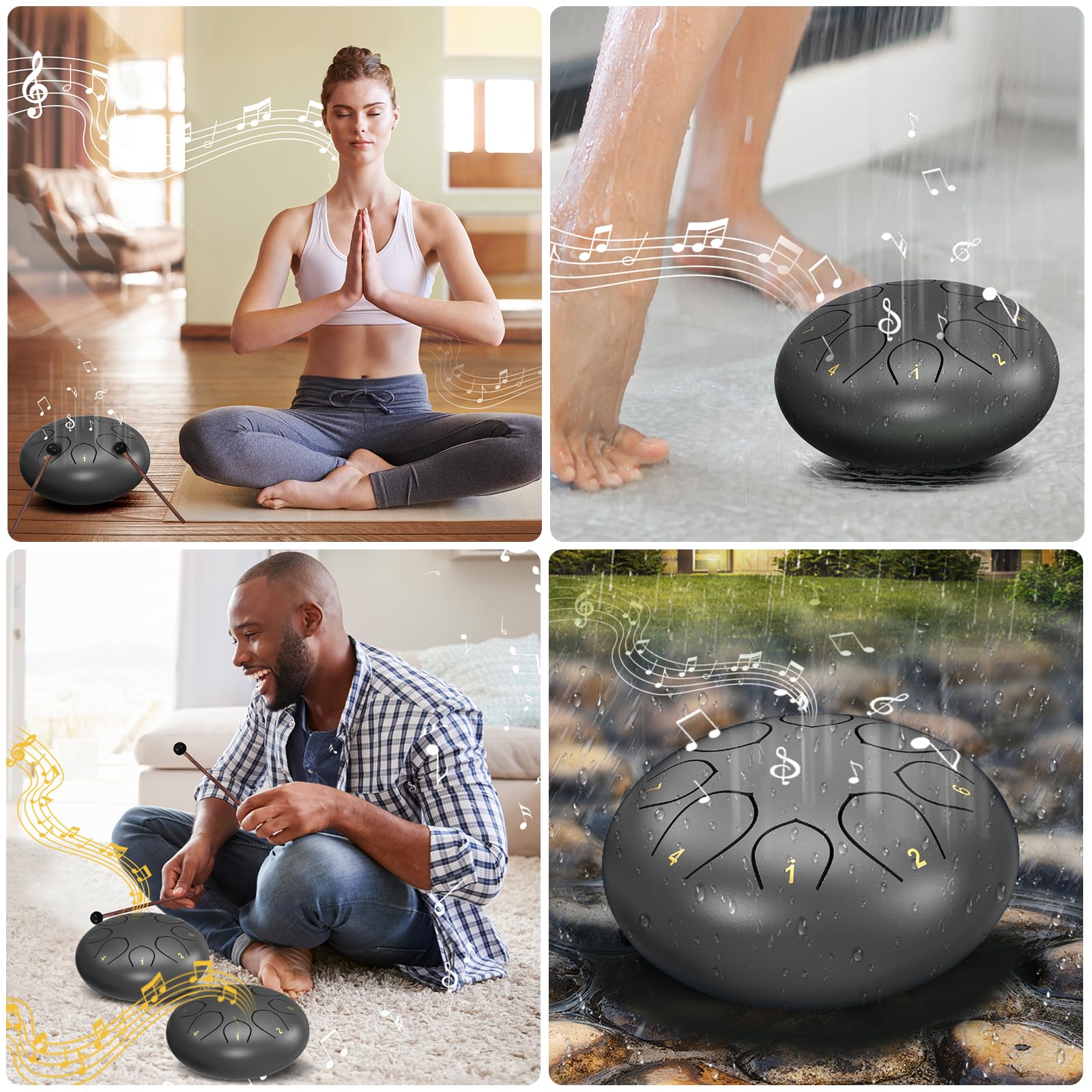 HIGH-QUALITY CRAFTSMANSHIP: Expertly crafted, this 6-inch chakra drum for rain is made from titanium alloy and coated with paint for exceptional corrosion and rust resistance, and can withstand various weather conditions. Each steel tongue drum is hand-tuned and precisely cut to ensure achieve accurate tones and harmonies.