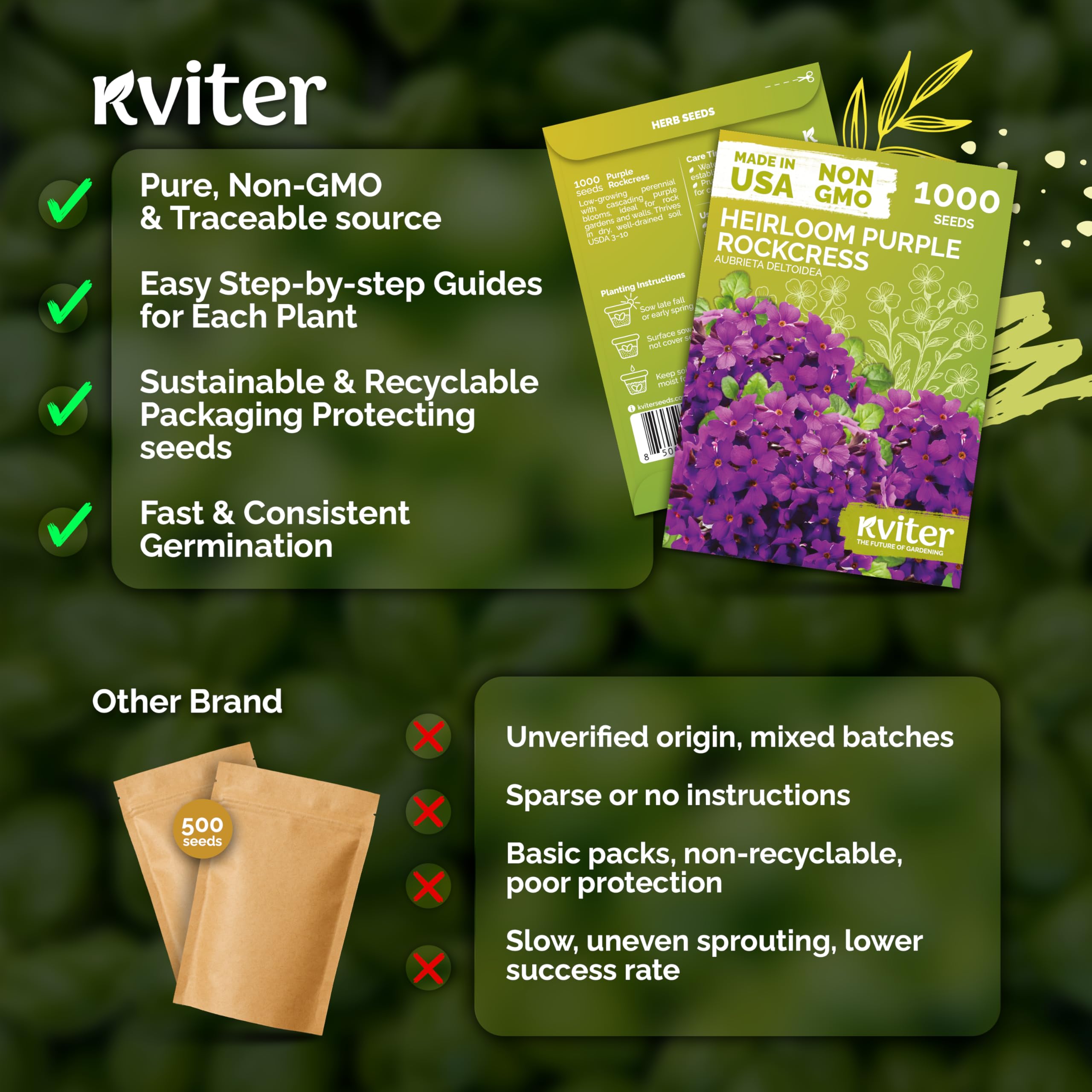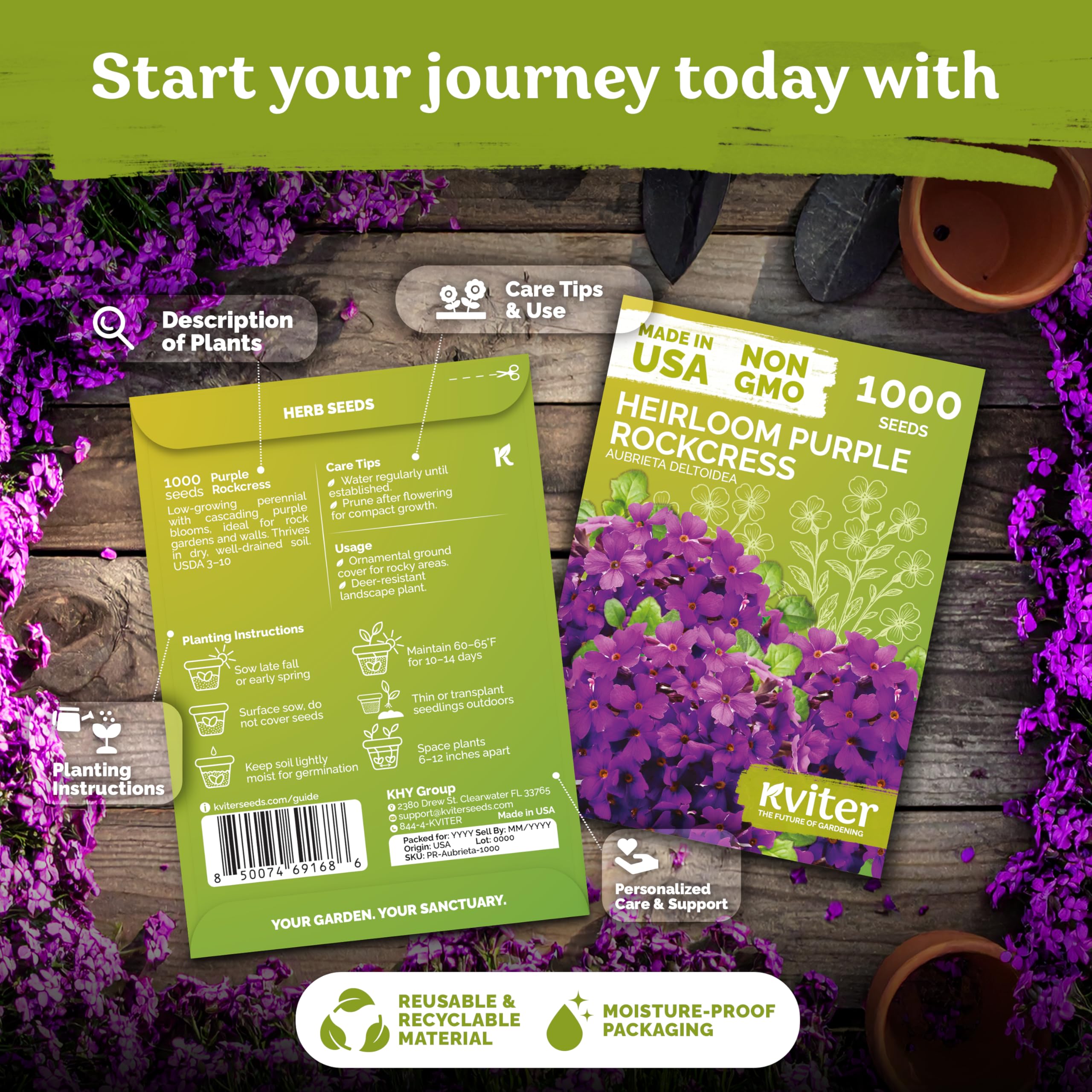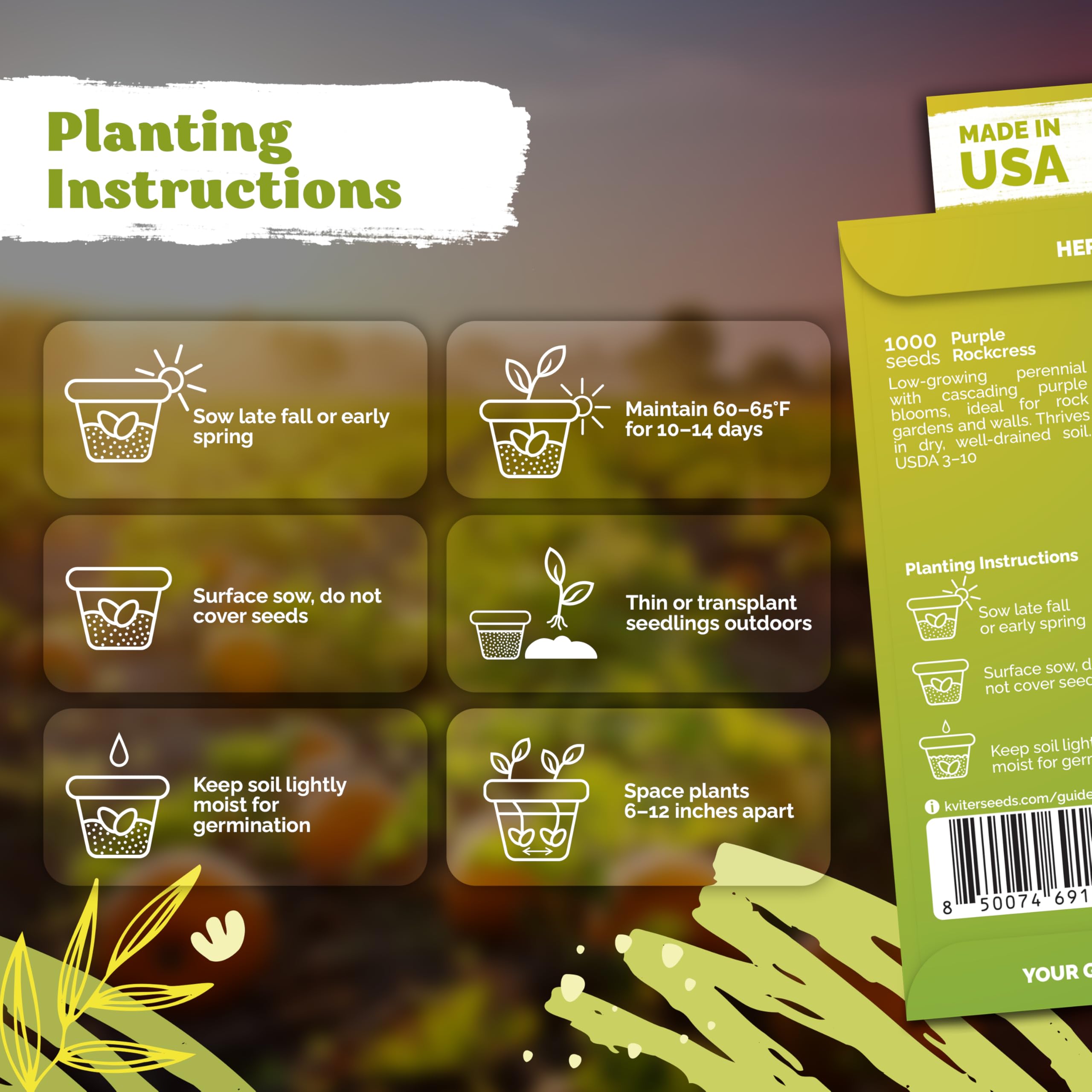 Quick Germination: Surface-sow purple rockcress flower seeds; light required. Sprouts in 10–14 days at 60–65°F. Start indoors 6 weeks before last frost — garden seed planting, great seeds for planting.