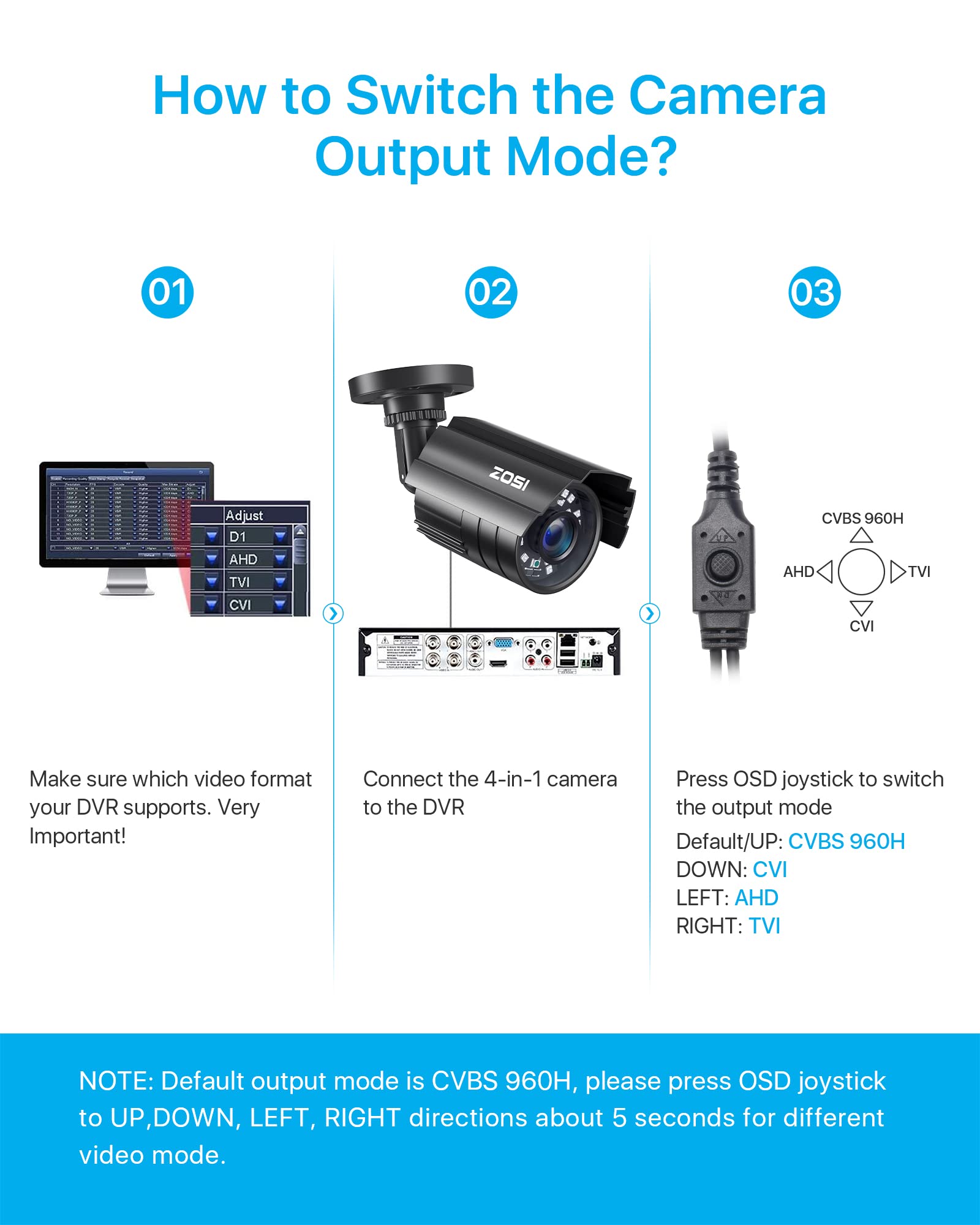 【Bulit in OSD Menu】It comes with OSD Menu which can change 4 different video output, 1080P AHD, 1080P CVI, 1080P TVI and 960H CVBS. The default video mode is 960H mode, compatible with all analog DVRs. The 1080P video mode needs to be switched according to your 1080P DVR type. Widely Usage: With the OSD menu, you can change the signal mode freely and quickly within 5 seconds.