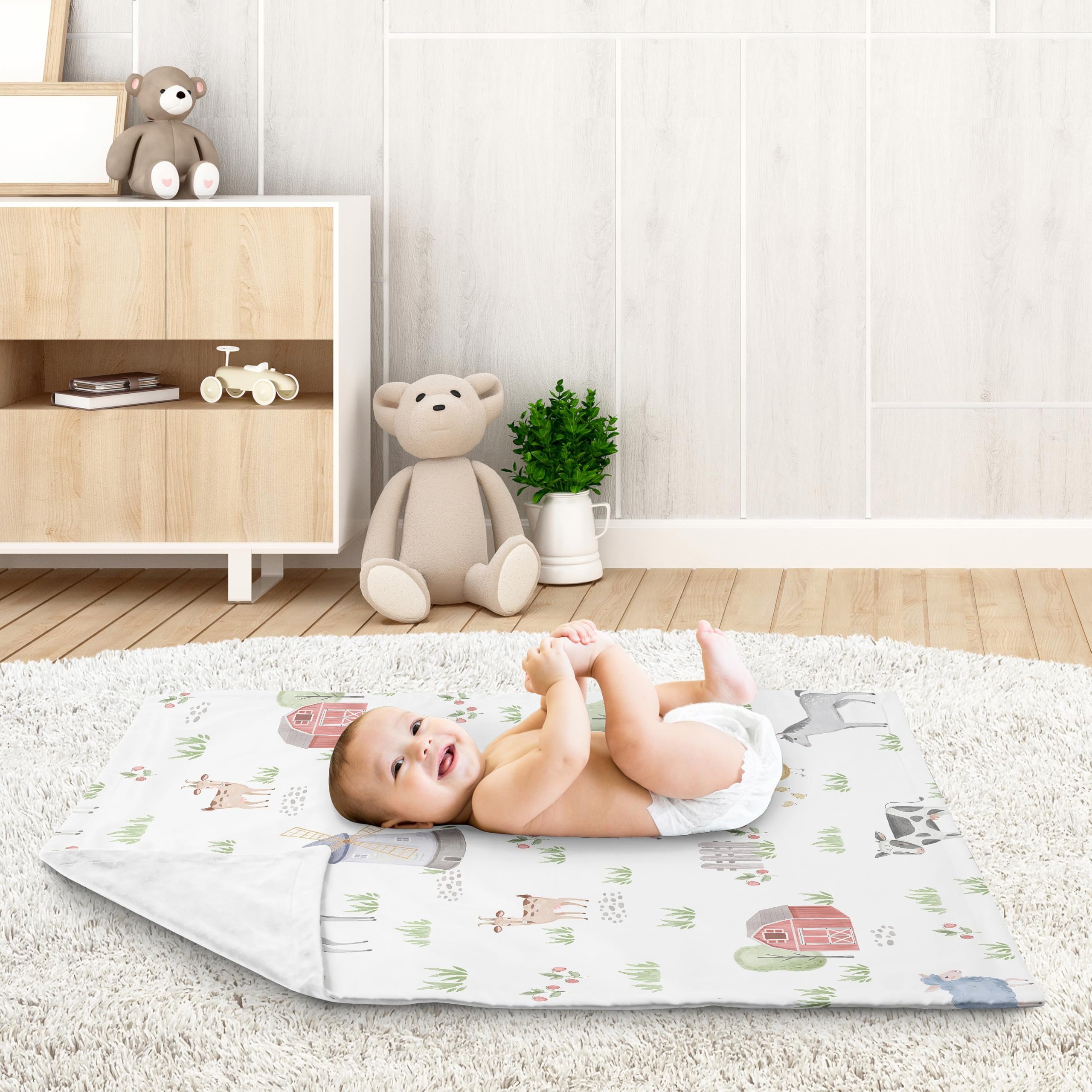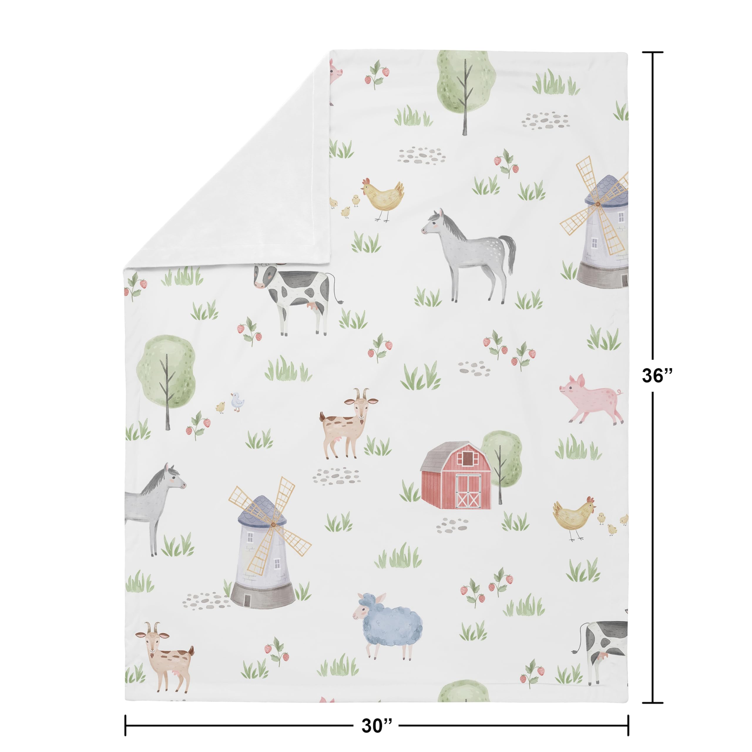 Blanket is designed using a multicolor watercolor farm animal brushed microfiber print and reverses to soft white minky