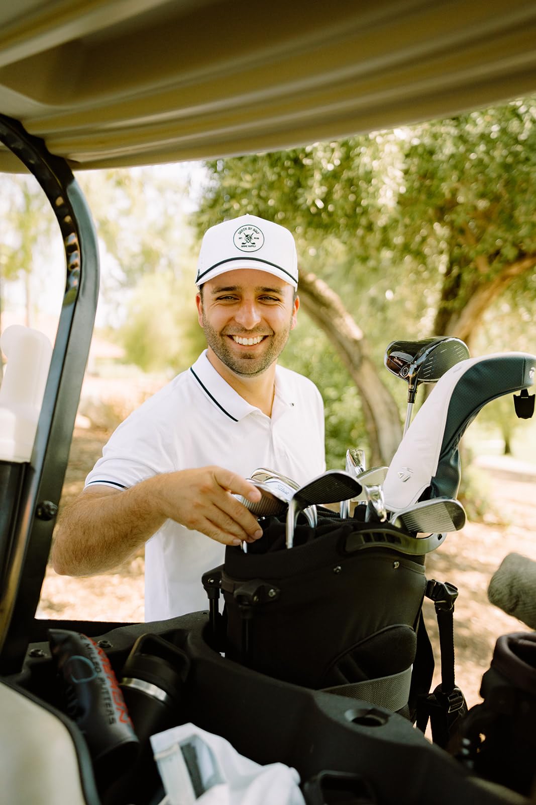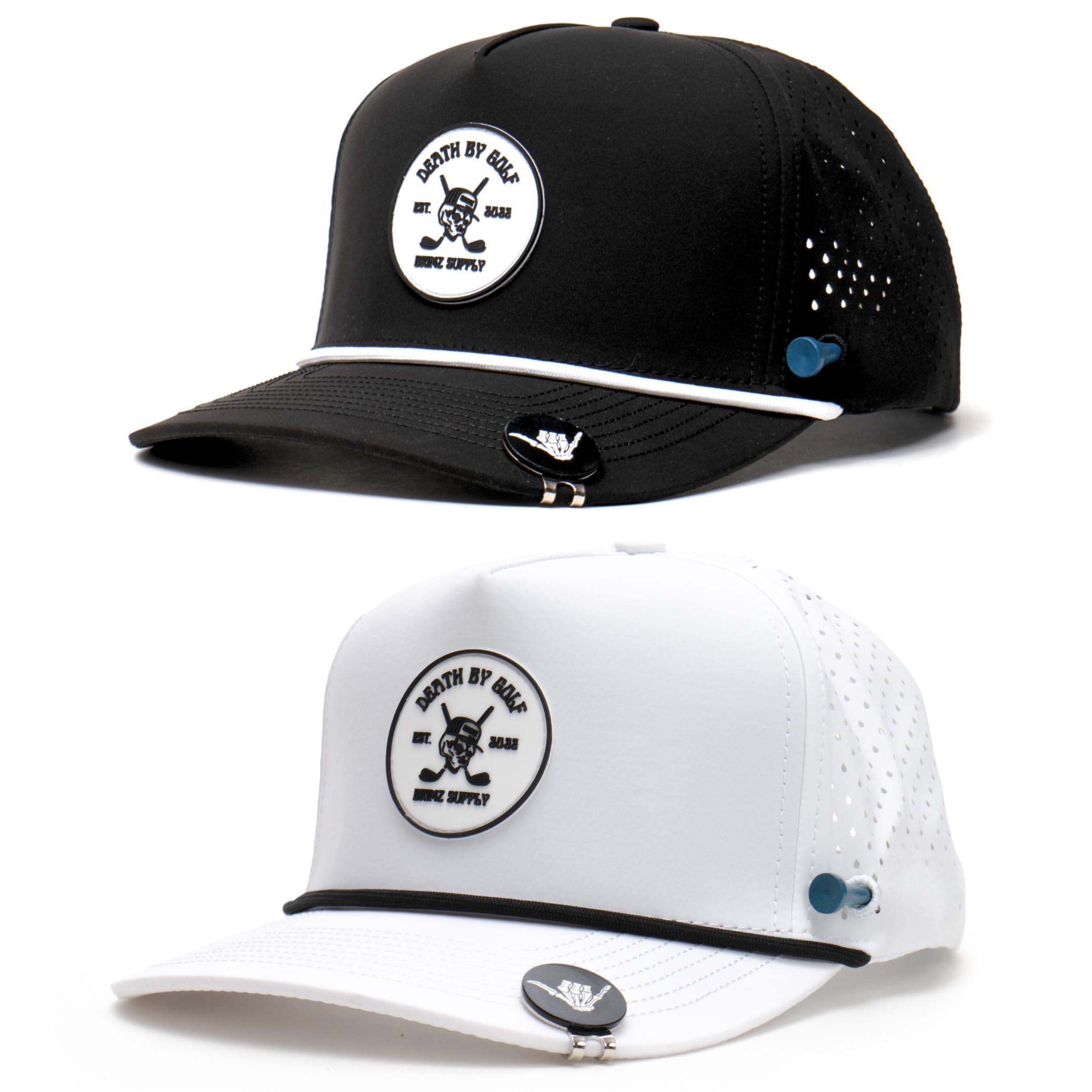 CLASSIC DESIGN, MODERN PERFORMANCE: The five-panel baseball cap style is complete with a magnetic ball marker that attaches to the hat, a hole on the side of the hat to hold your tee, 3D rubber mold patches, and made with a polyester spandex blend with a built-in sweat band for superior sweat resistance, flex-fit hold, and ventilation.
