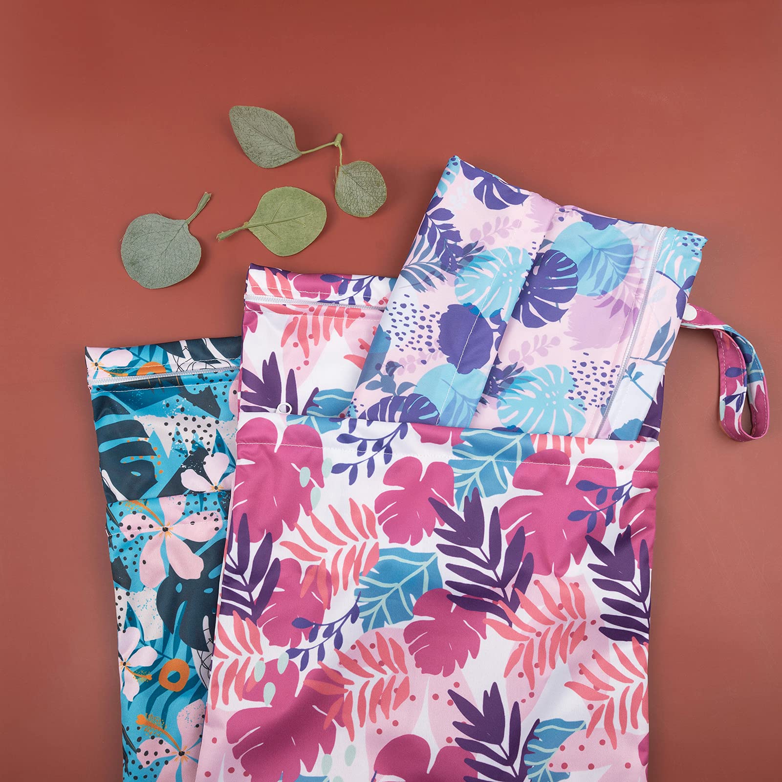 Double-Pocket Design with Snap Handle: Each wet bag contains two pockets, which comes with two zip closures to ensure that nothing will drop out of the bag and better to keep the clean and dirty items separately. With the snap handle design, you can unbutton the haddle and easily hang the bag on the stroller or door knobs, towel rod ect. anywhere you want.