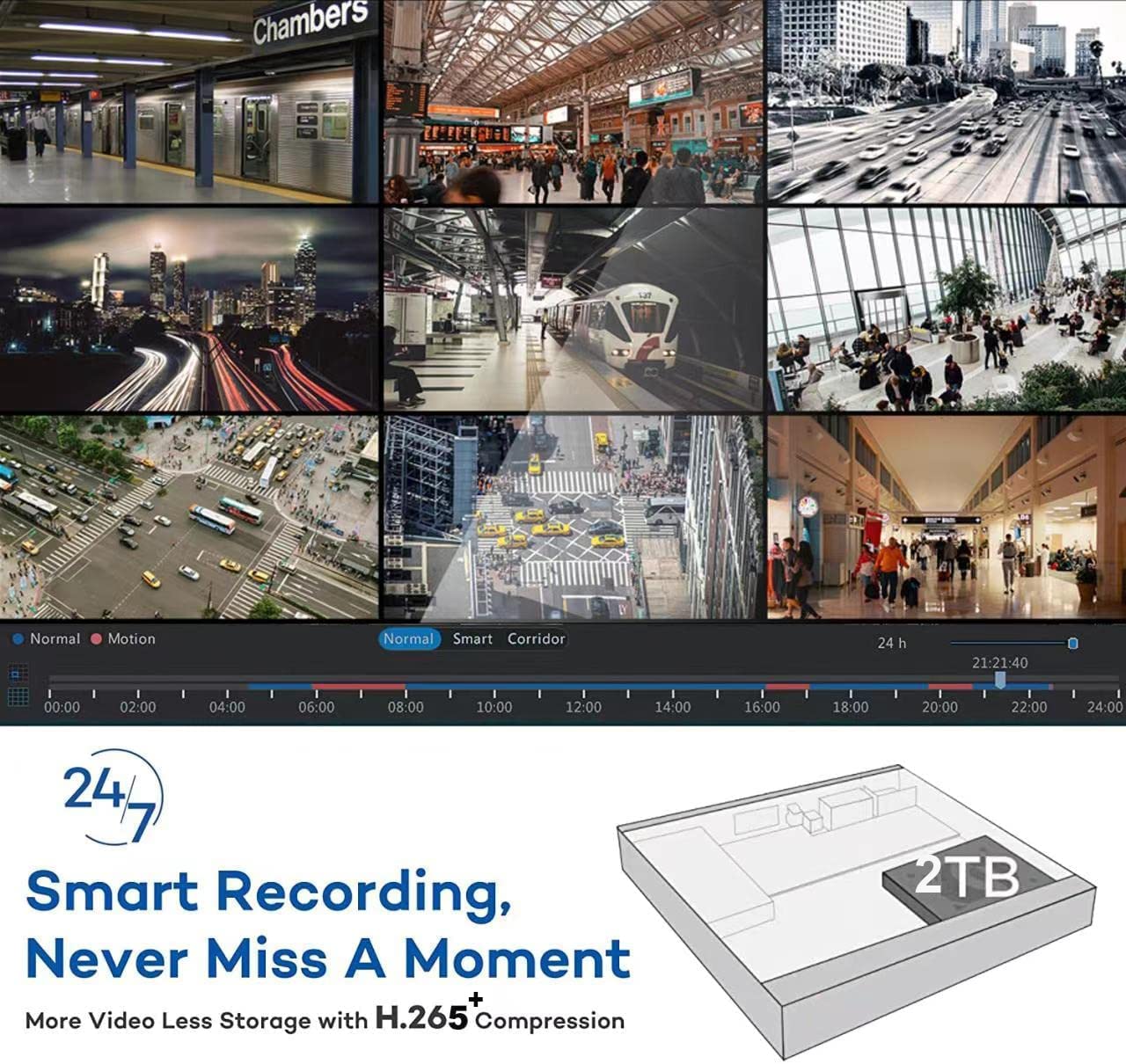2TB HDD & H.265 Coding: 16 Channel DVR comes with a Pre-Installed 2TB Surveillance Hard Drive, H.265 coding offers longer record time, saving more storage space than H.264 systems.