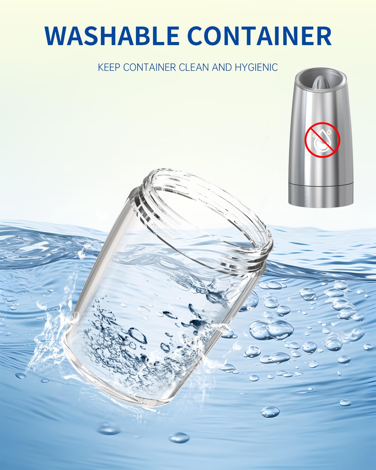 【Bright LED Light】Our salt and pepper shakers set electric features a bright blue LED light that turns on automatically when in use. The LED light lets you easily see how much seasoning you're adding, even in low-light conditions