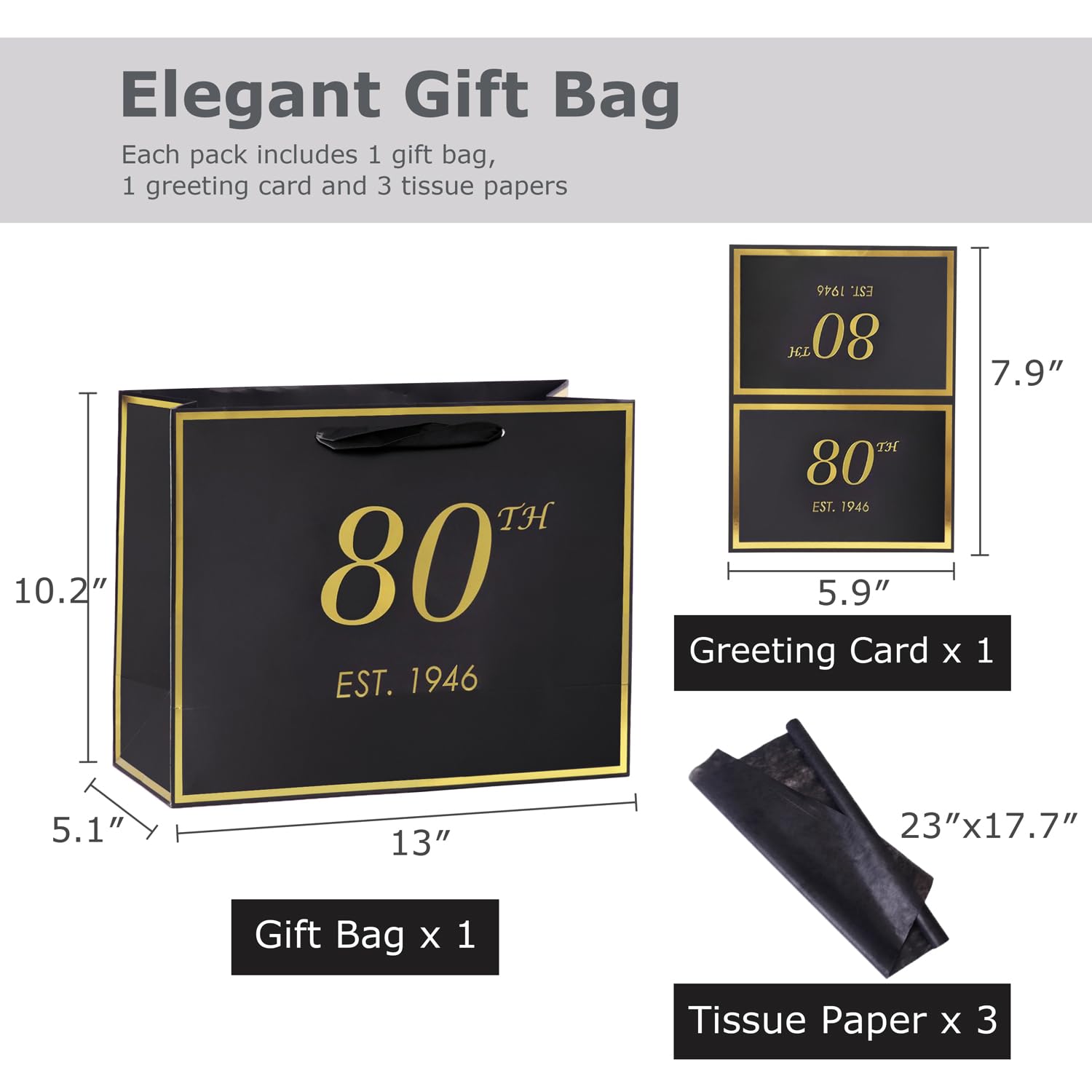 Personalized 80th Birthday Gift Bag: Each gift bag comes with 1 matching greeting card and 3 tissue papers. The gift bag measures 13" length × 10.2" height × 5.2" width, the greeting card measures 7.9" length × 5.9" width, and the tissue paper measures 23.6" length × 17.7" width, providing a stylish presentation for your gifts.