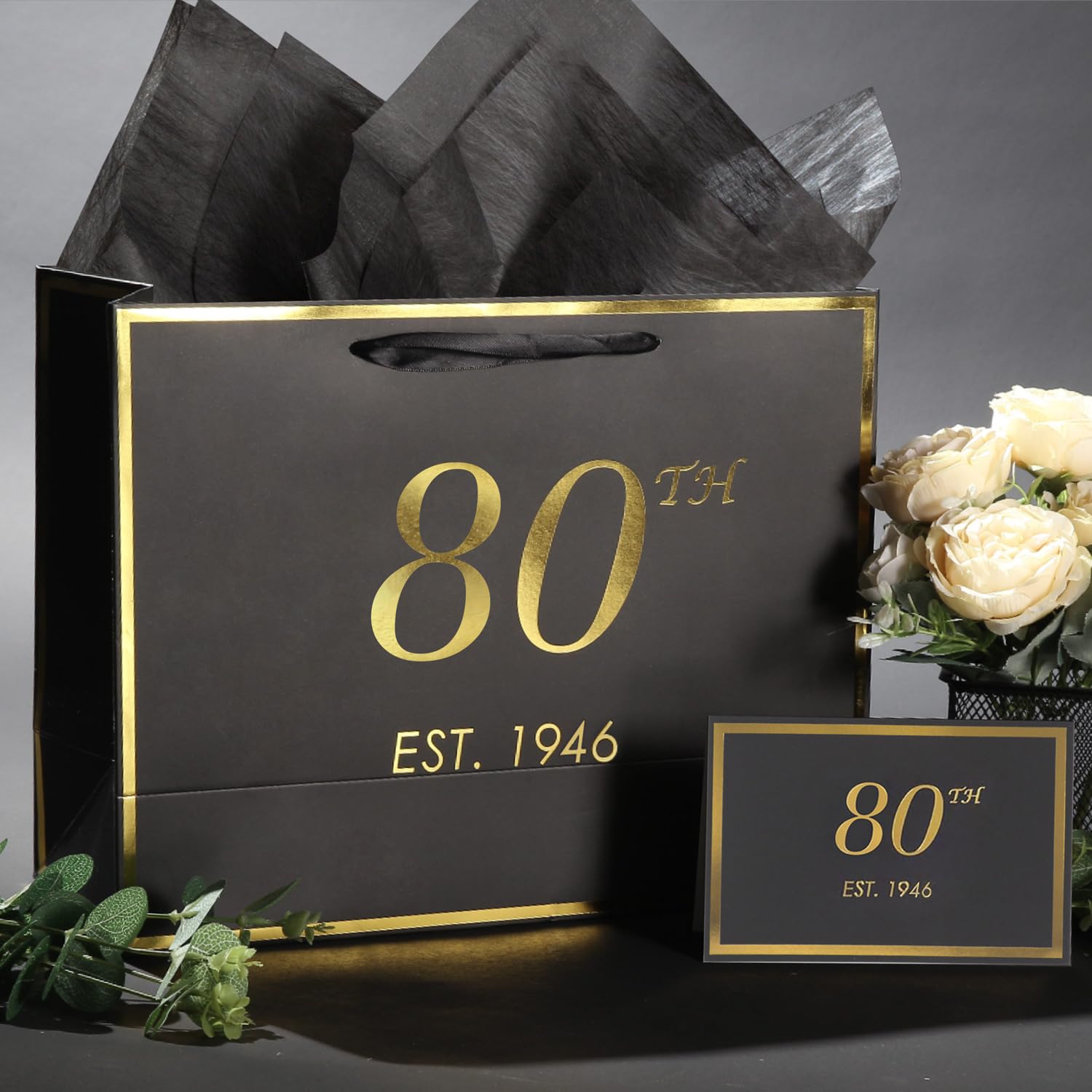 momoake 80th Birthday Gift Bag with Card and Tissue Paper for Men Women, 1946 80 Year Old 13" Elegant Black Gold Anniversary Keepsake Party Present Shopping Paper Bags for Gifts Wrapping (1946 80th)