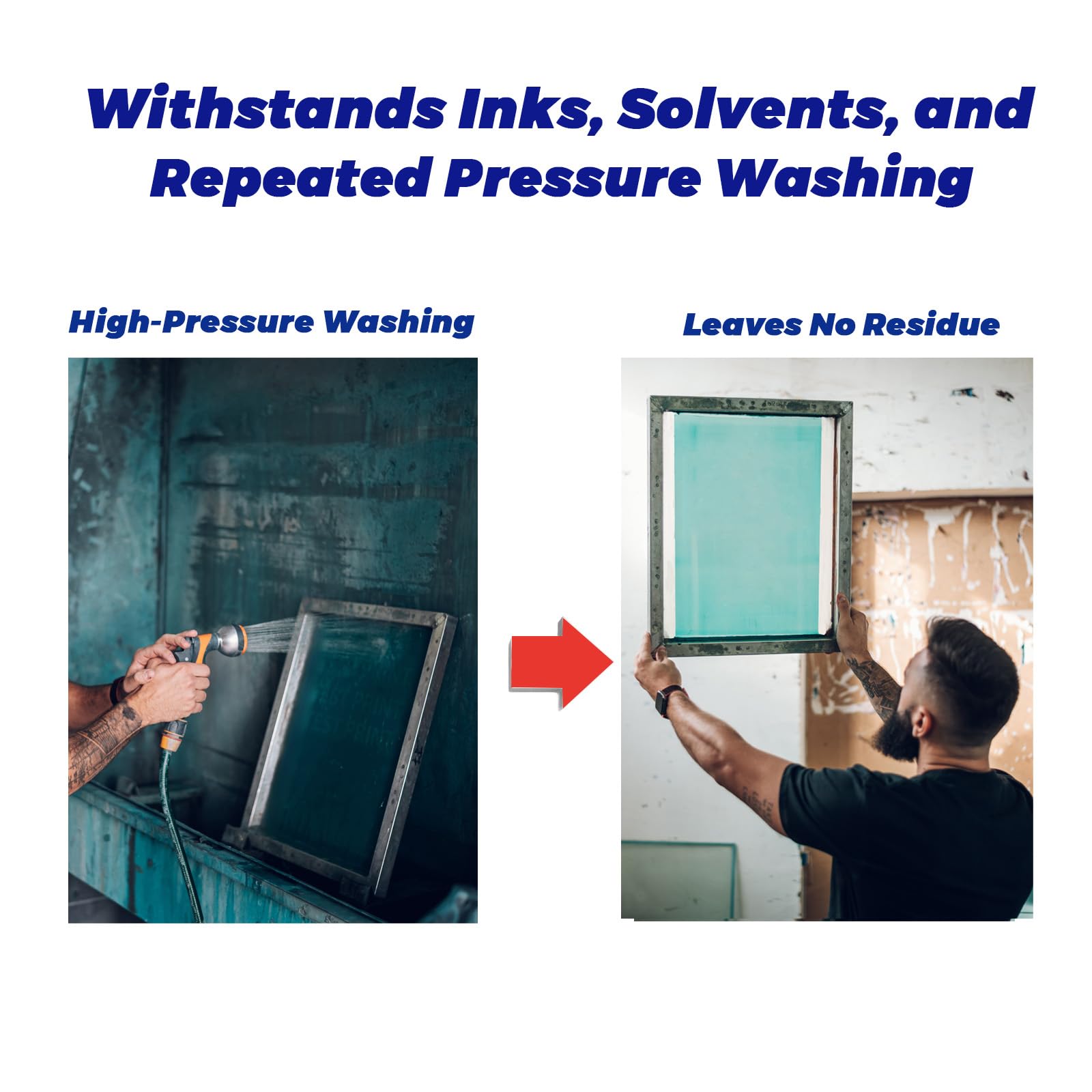 Durable and Long-Lasting: Masking tape for screen printing sticks firmly for weeks without damaging mesh, works on various frame materials including aluminum and wood, resists inks and solvents, and can withstand multiple high-pressure washes and solvent cleanings to keep screens clean and durable