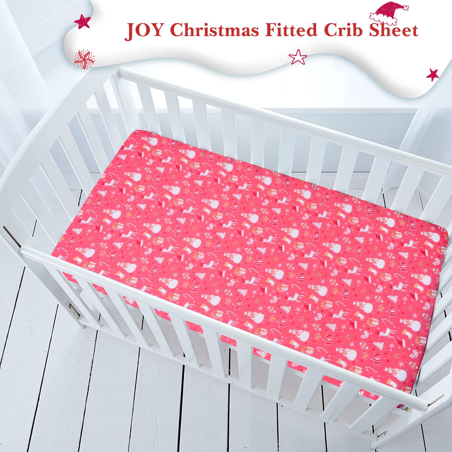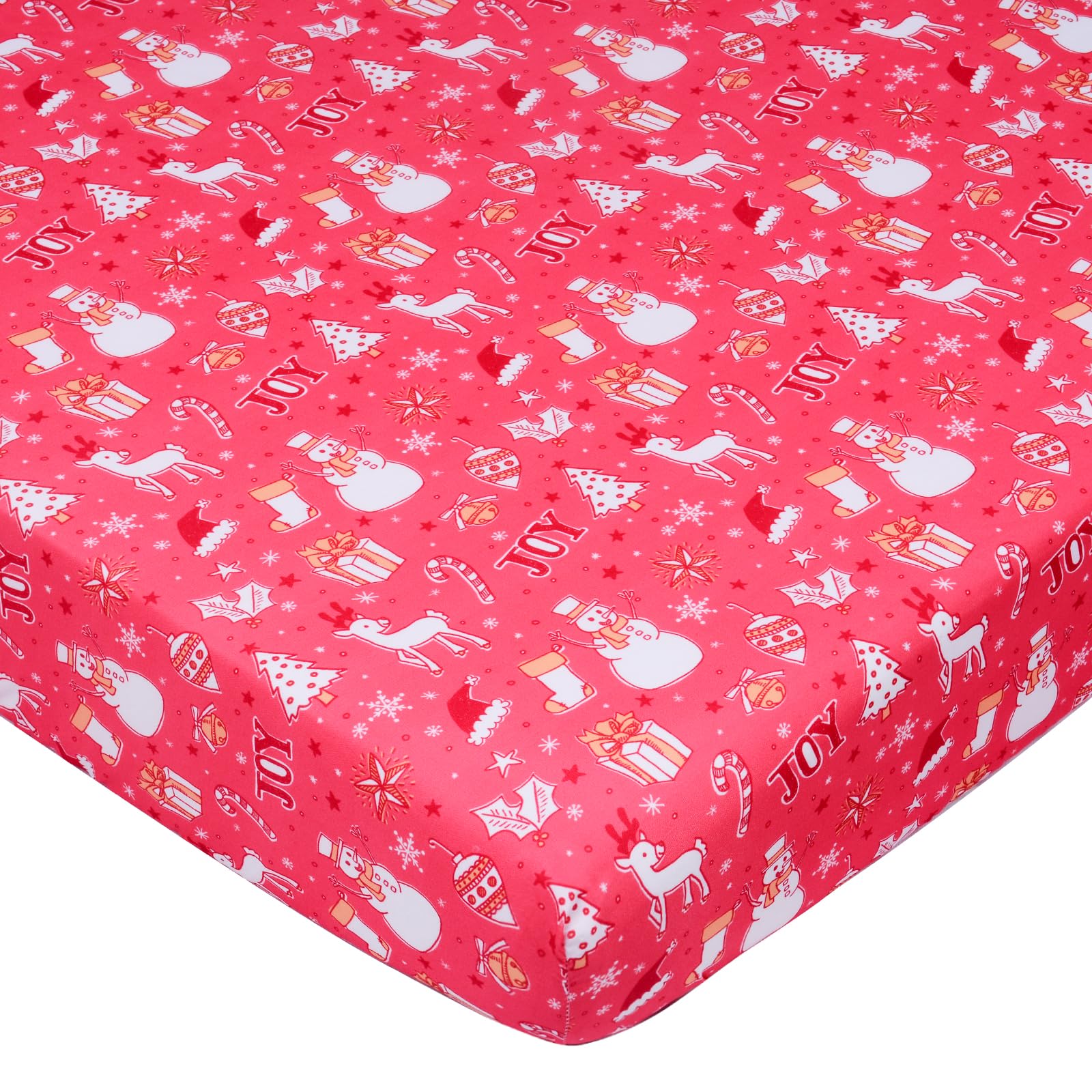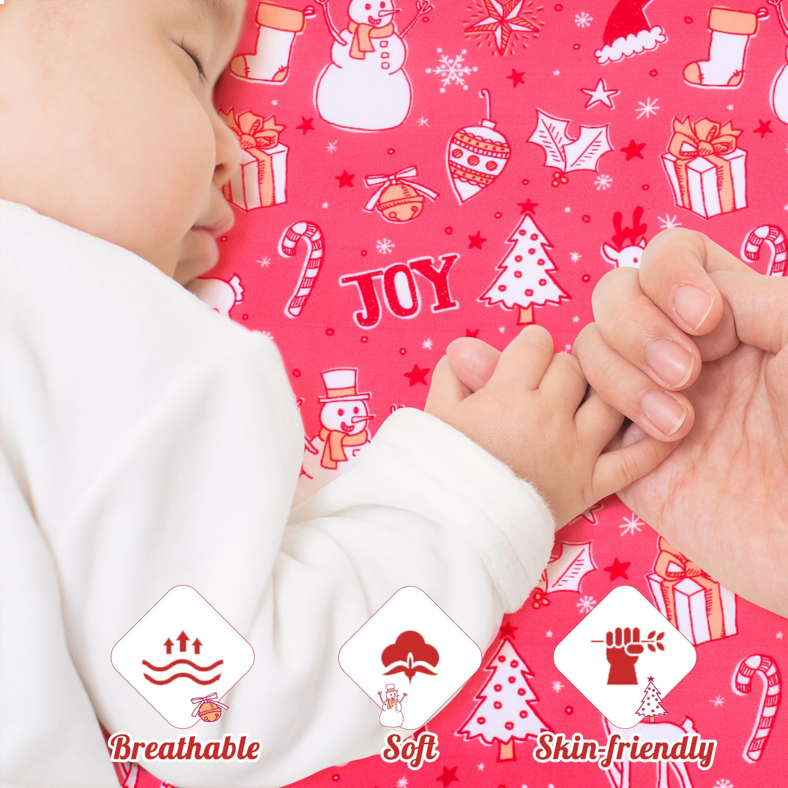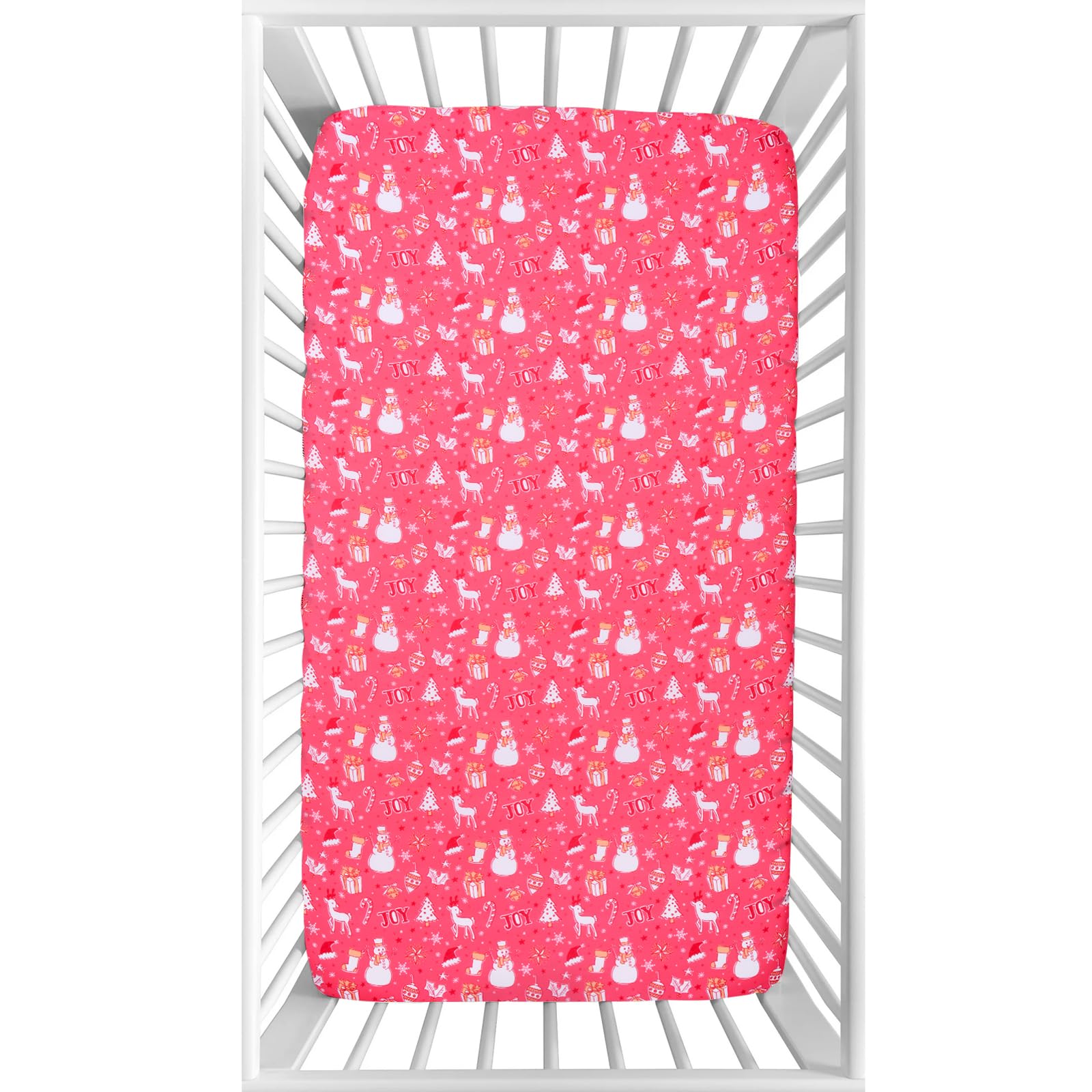 Festive Christmas Design: Featuring joyful holiday patterns like snowflakes, stockings, and Christmas trees on a soft pink background, this sheet brings festive cheer to your nursery. Perfect for creating a magical holiday atmosphere for your little one.