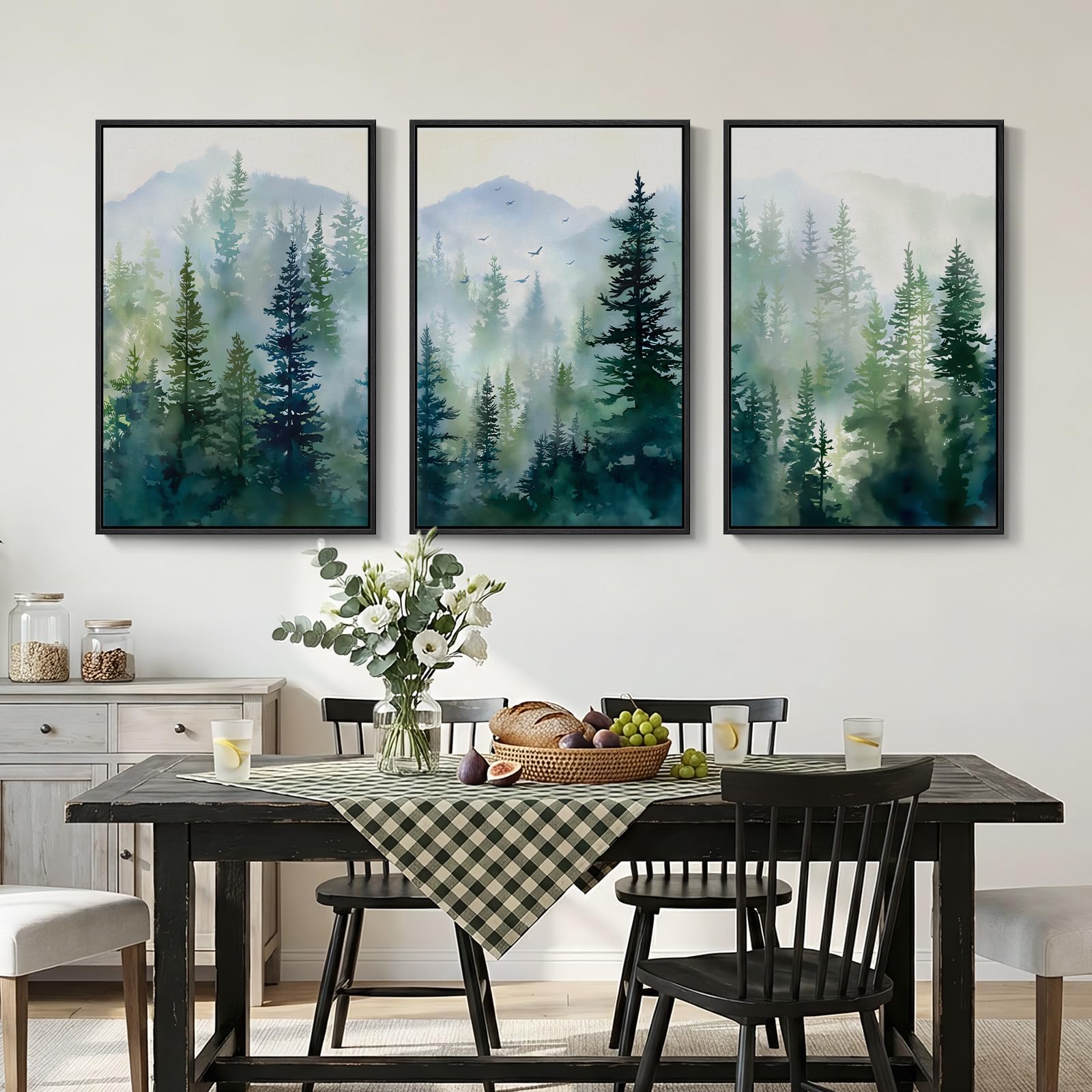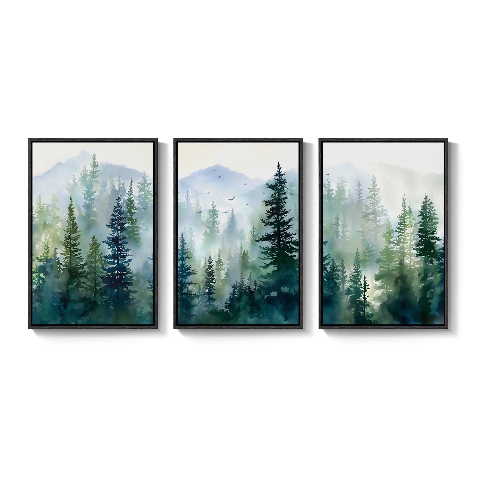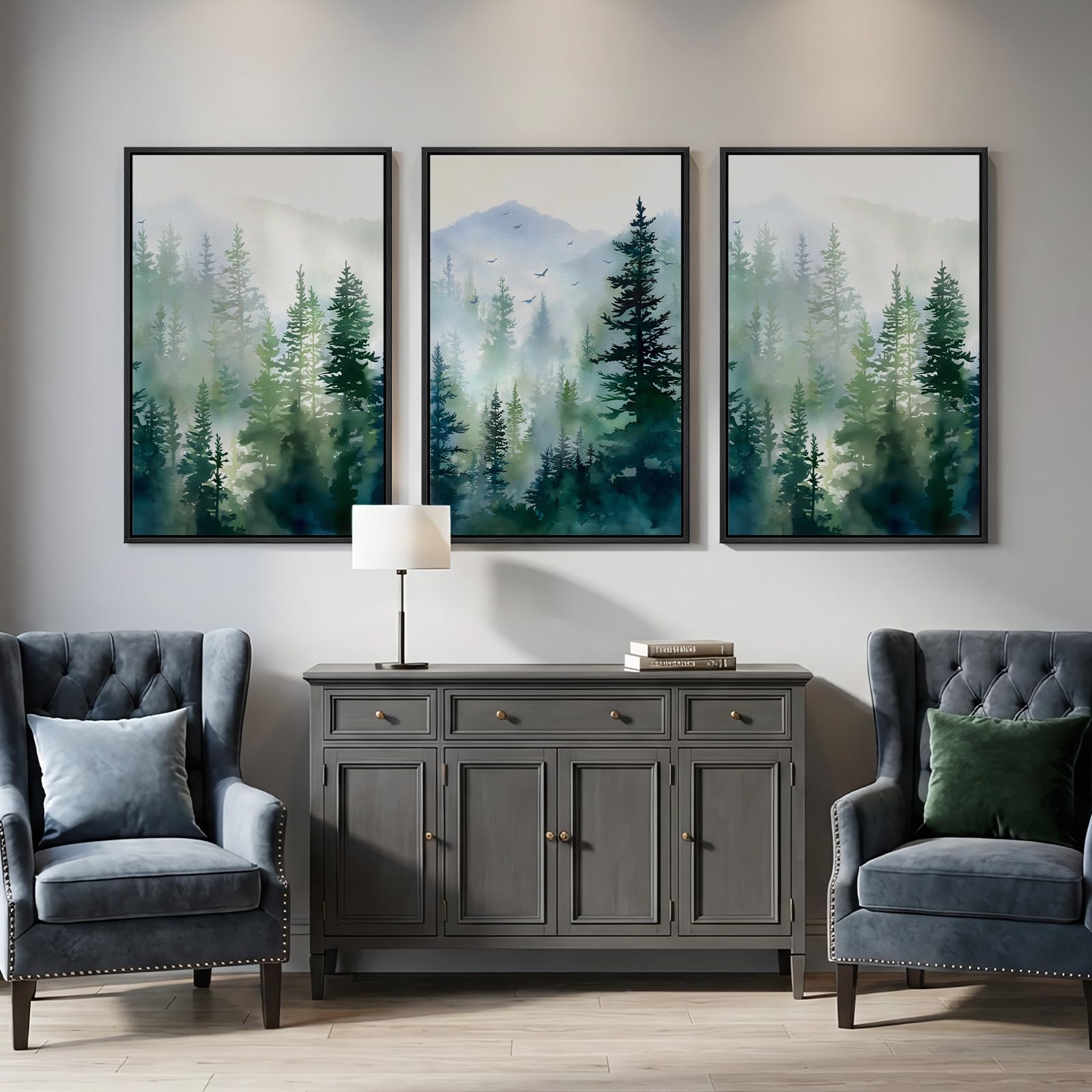 [Forest Landscape Wall Art]: Misty pine forest and distant mountains flow across three panels in a soft watercolor style. Birds in flight add movement and calm. Rich green and blue tones create a peaceful nature scene. Each wall art measures 24"Wx36"H, forming a wide triptych statement when grouped