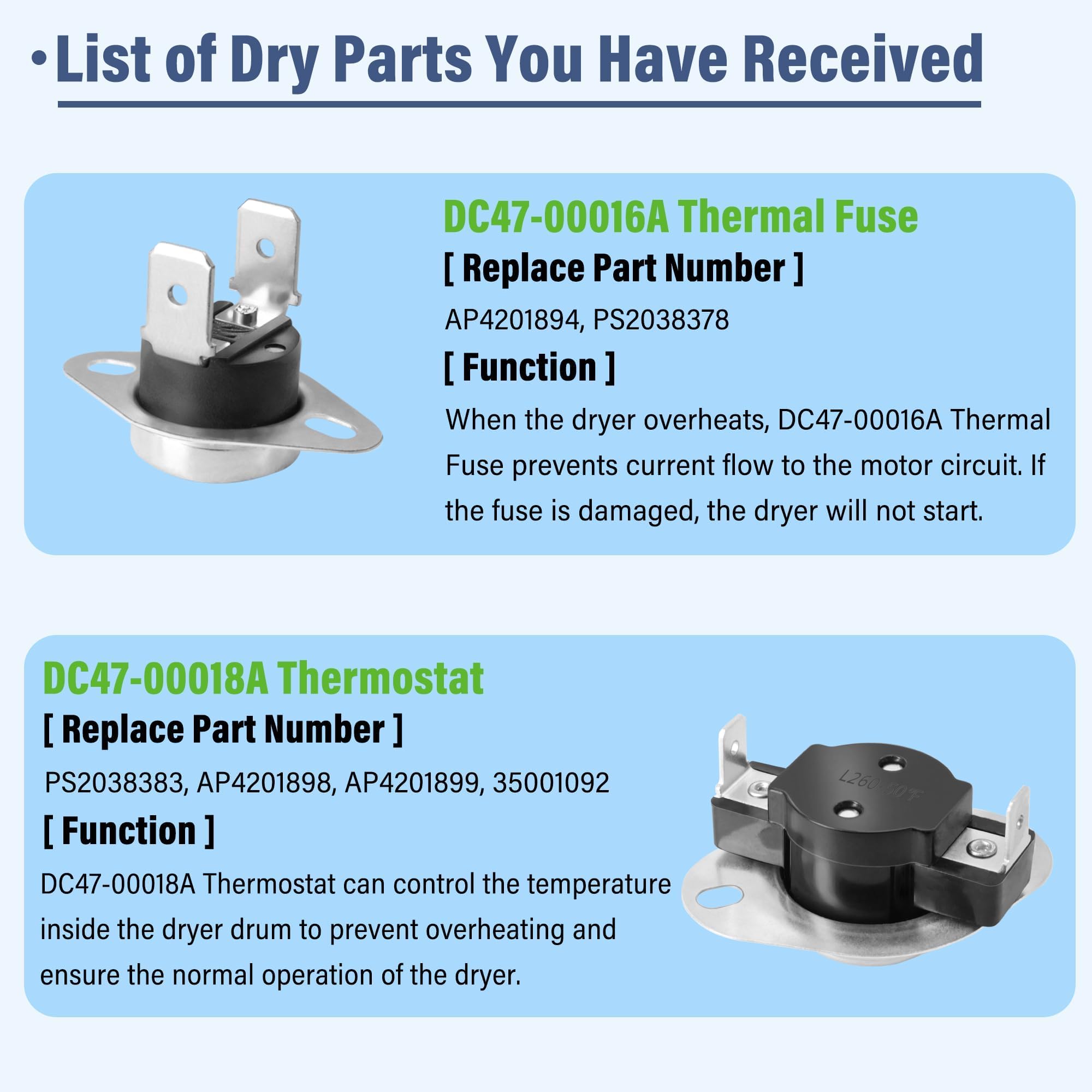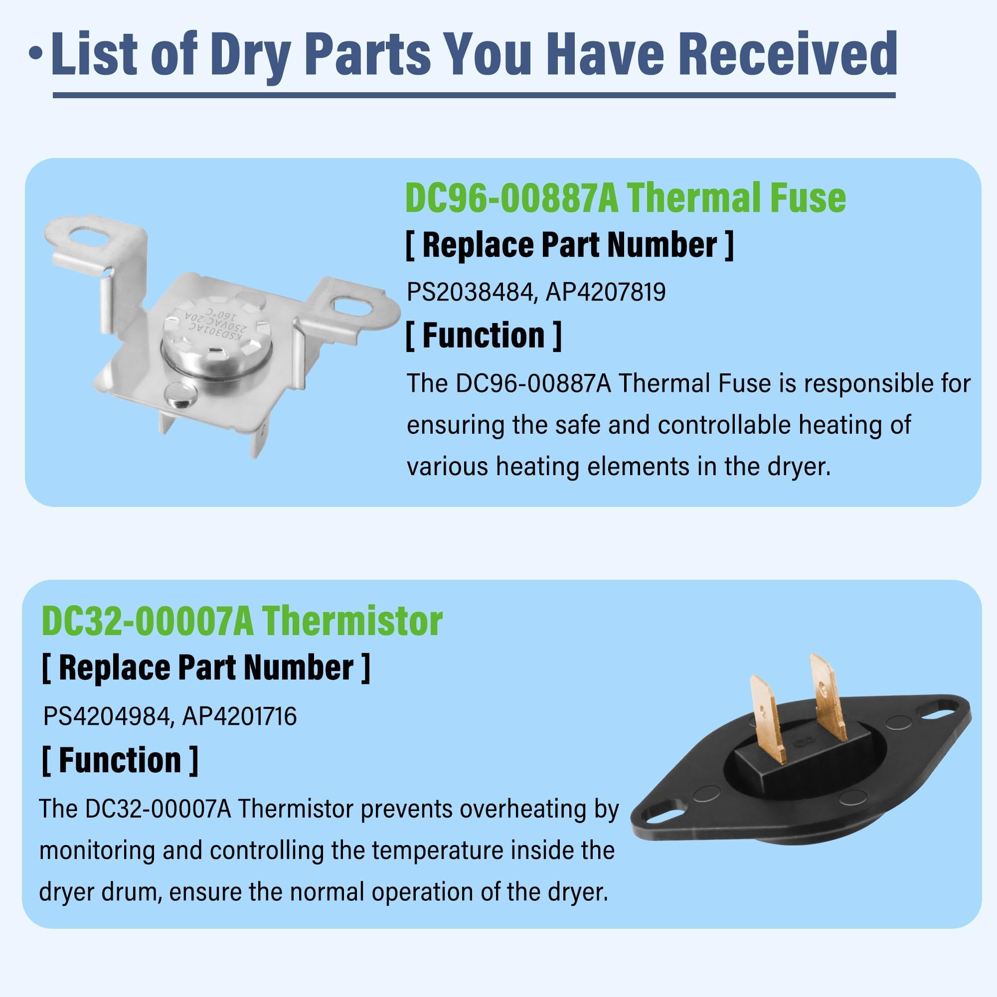 This dryer heating element kit Including: 1 x Dryer Heating Element Fit for Sam-sung, 1 x DC47-00018A Dryer Thermostat, 1 x DC96-00887A Dryer Thermal Fuse with Bracket, 1 x DC47-00016A Dryer Thermal Fuse, 1 x DC32-00007A Dryer Thermistor.