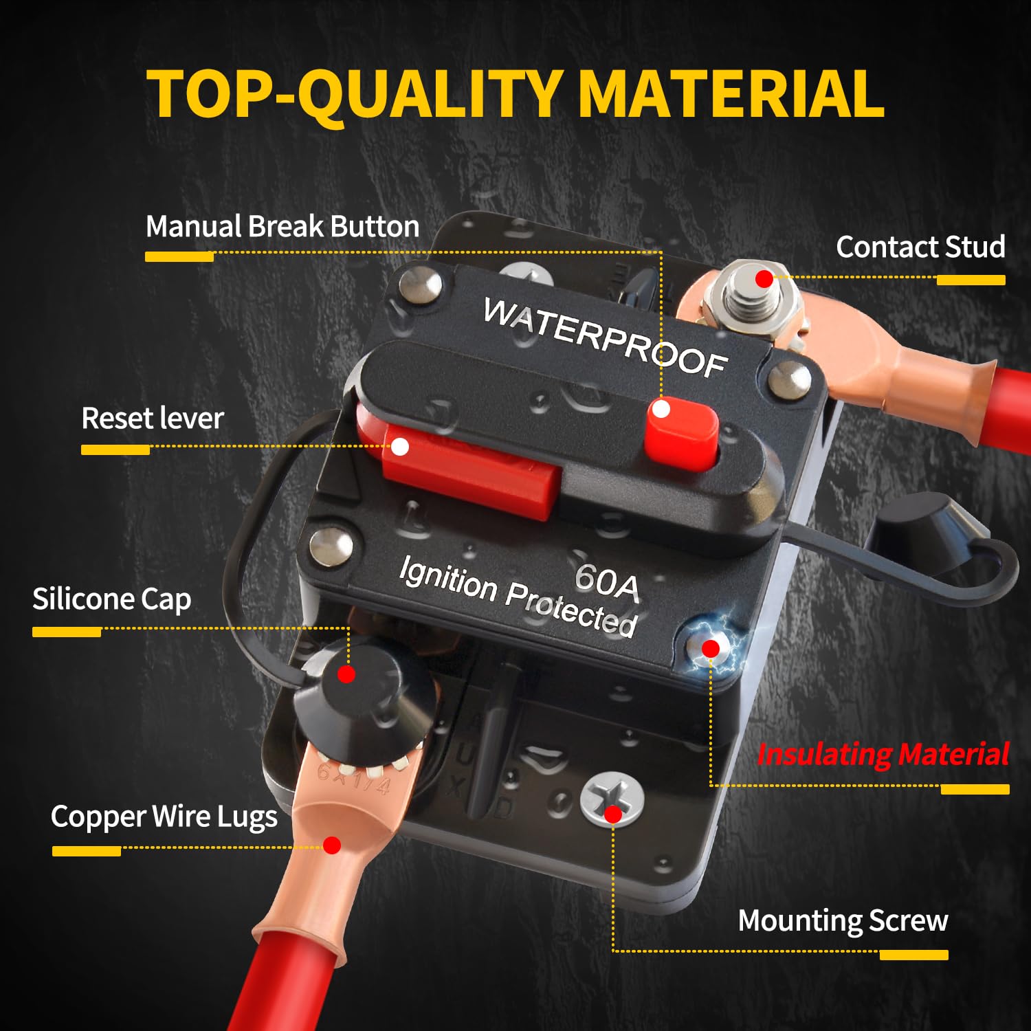 【Specification】: 60 Amp Circuit Breaker 12v, Operating Voltage: DC 12V - 48V, Waterproof IP 67, Meet S.A.E. J1625, J1171, UL1500 (Ignition Protected). Widely used in marine and automotive circuits, suitable for Boat, Yacht, Kayak, RV, Trailer, Bus, Truck, Winches, ATV, solar system etc.