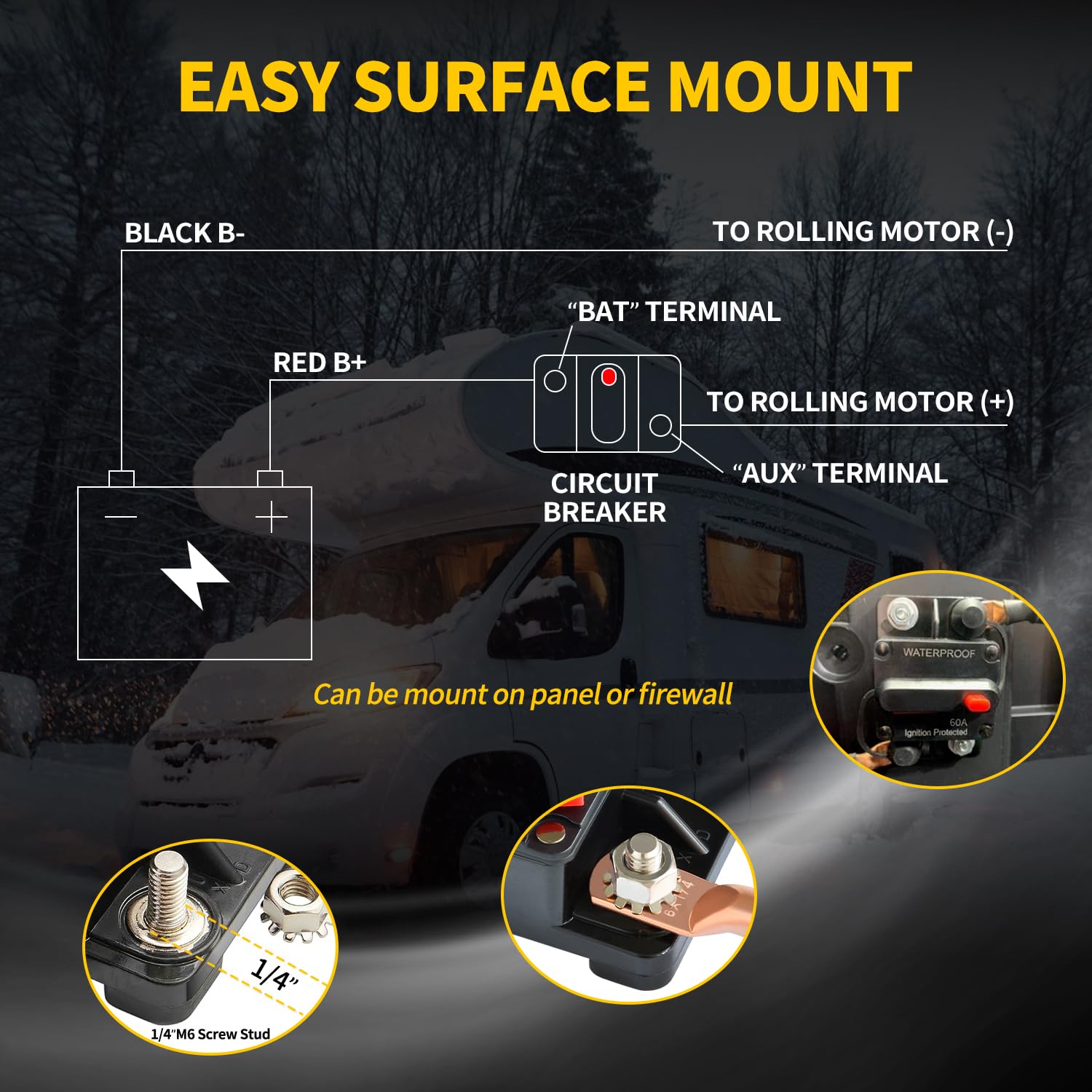 【Easy Surface-Mount】: Bolipoeq 12v dc circuit breaker is surface-mount design, simply mount them on panel or firewall, hassle-free installation. What you get: 4 x auto 60 amp Breaker, 8 x Wire Lugs, 16 x Washers, 12 x Mounting Screws.