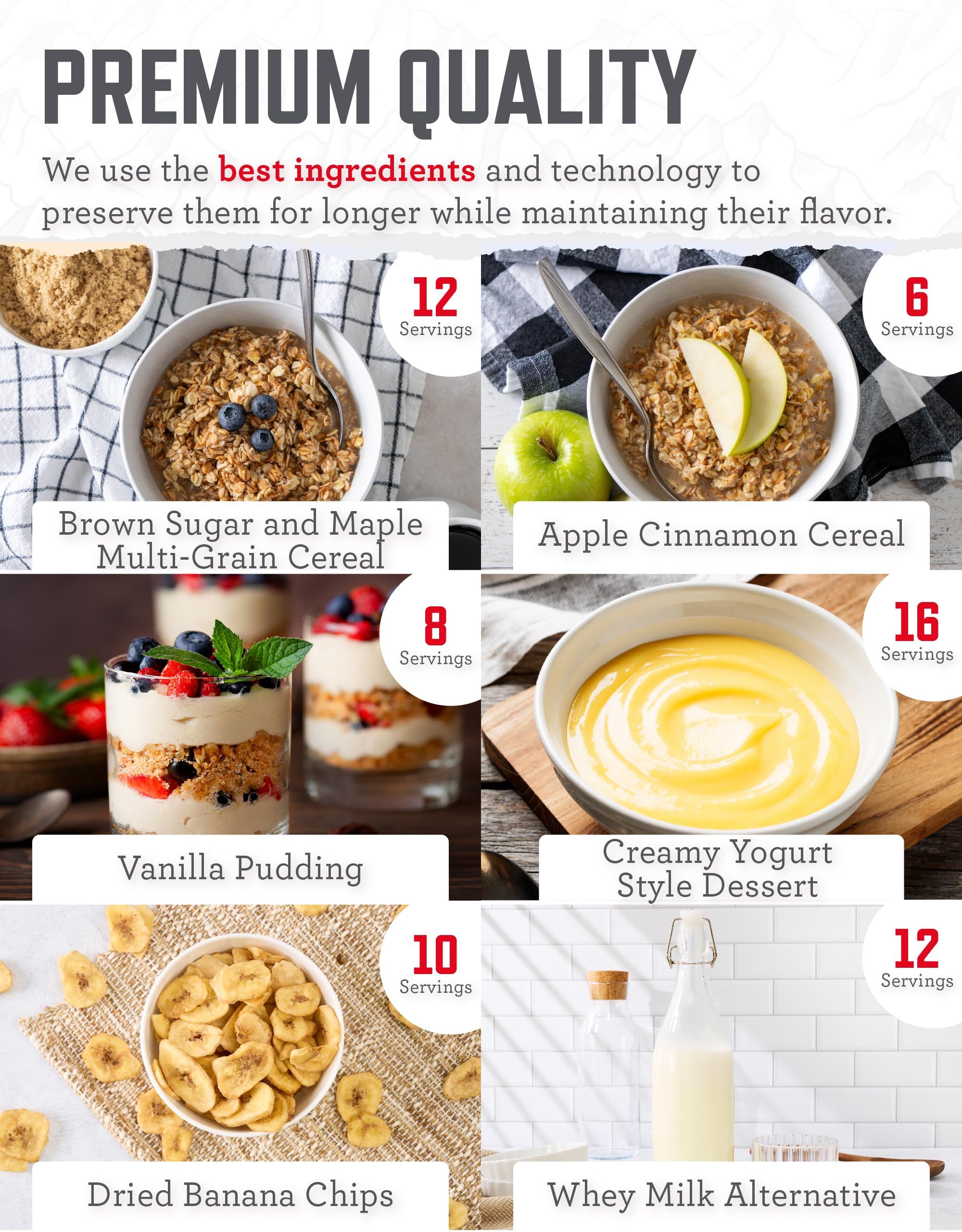 NUTRITIOUS MEALS: Our survival food kit offers not only convenience but also tasty, nutrient rich options, such as freeze dried banana chips, pasta alfredo, tomato basil soup, our whey milk alternative, & more to enhance your outdoor meals reliably.