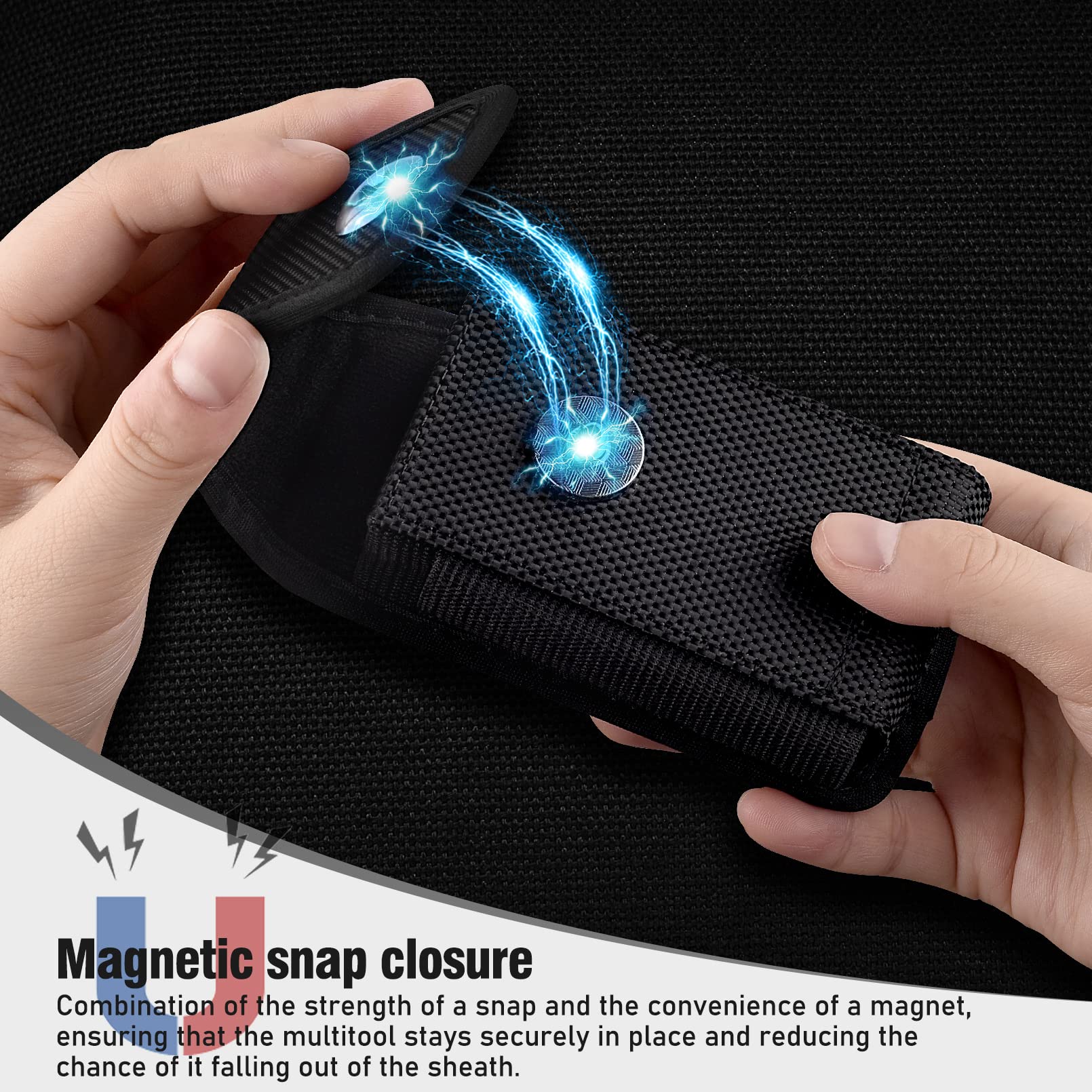 Magnetic snap closure:Combines a snap and a magnet to keep your multitool secure and easily accessible. The snap adds extra protection, while the magnet holds the tool firmly in place, reducing the risk of it slipping out of the multitool pouch