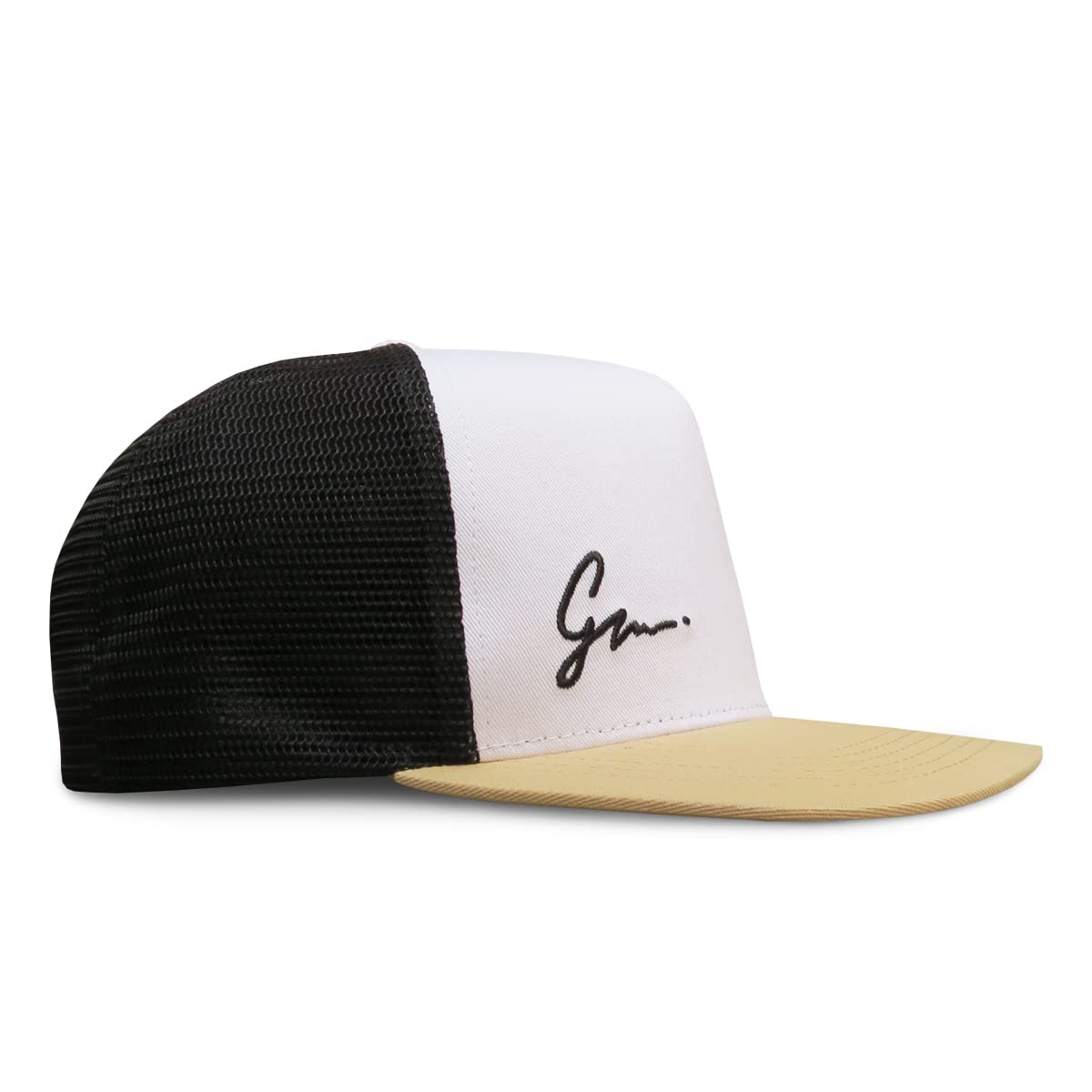 SMOOTH TRUCKER- This White & Sand Grace Folly flat bill trucker hat is sure to impress! Structured 5 panel trucker cap with mesh back and adjustable snapback. Be the envy of your friends in this old school trucker.